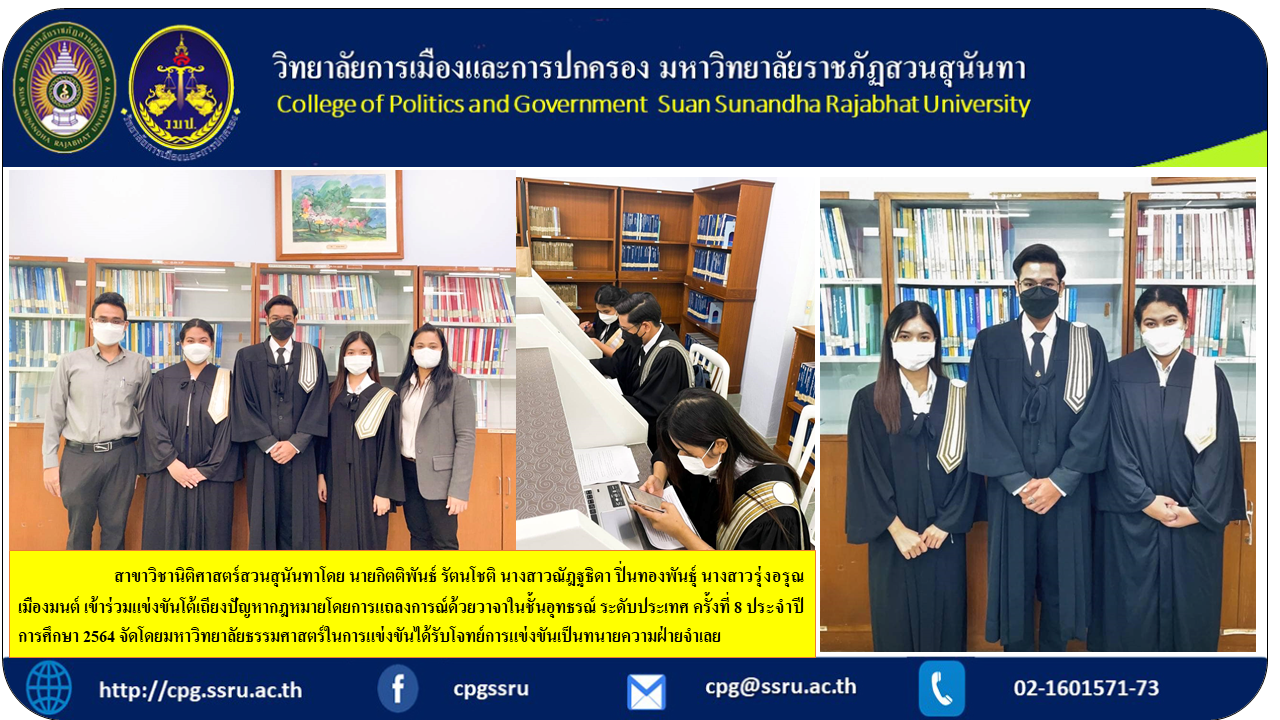 Suan Sunandha Law School by Mr. Kittiphan Rattanachot Ms. Natthida Pinthongphan Ms. Rung-arun Muangmon participated in the 8th National Level Appeal Competition for arguing legal issues, organized by Thammasat University. In the competition, he received a contest as a defense attorney.