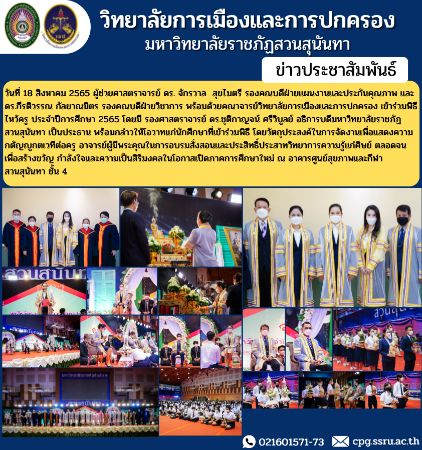 On August 18, 2022, Assistant Professor Dr. Chakrawan Sukmaitree, Associate Dean for Planning and Quality Assurance, and Dr. Kiratiwan Kalayanamit, Associate Dean for Academic Affairs. along with faculty members of the College of Politics and Governance Attending the Wai Kru ceremony for the academic year 2022, with Associate Professor Dr. Chutikarn Sriwiboon, President of Suan Sunandha Rajabhat University, was the chairman and gave a speech to the students who attended the ceremony. For the purpose of organizing the event to show gratitude to teachers Lecturer who is benefactor in teaching and teaching neuroscience knowledge to students as well as to create gifts Encouragement and prosperity on the occasion of the opening of the new semester at Suan Sunandha Health and Sports Center Building, 4th floo.