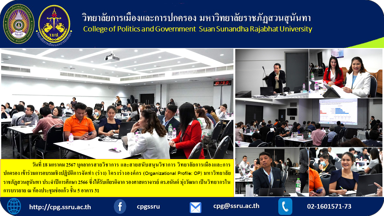 January 18, 2024 Academic personnel and academic support line College of Politics and Government Participate in a workshop on preparing (drafting) an organizational outline. (Organizational Profile: OP) Suan Sunandha Rajabhat University Academic year 2023, which was honored by Associate Professor Dr. Anant Mungwattana was the speaker in the lecture at the Chokaew conference room, 5th floor, Building 31.