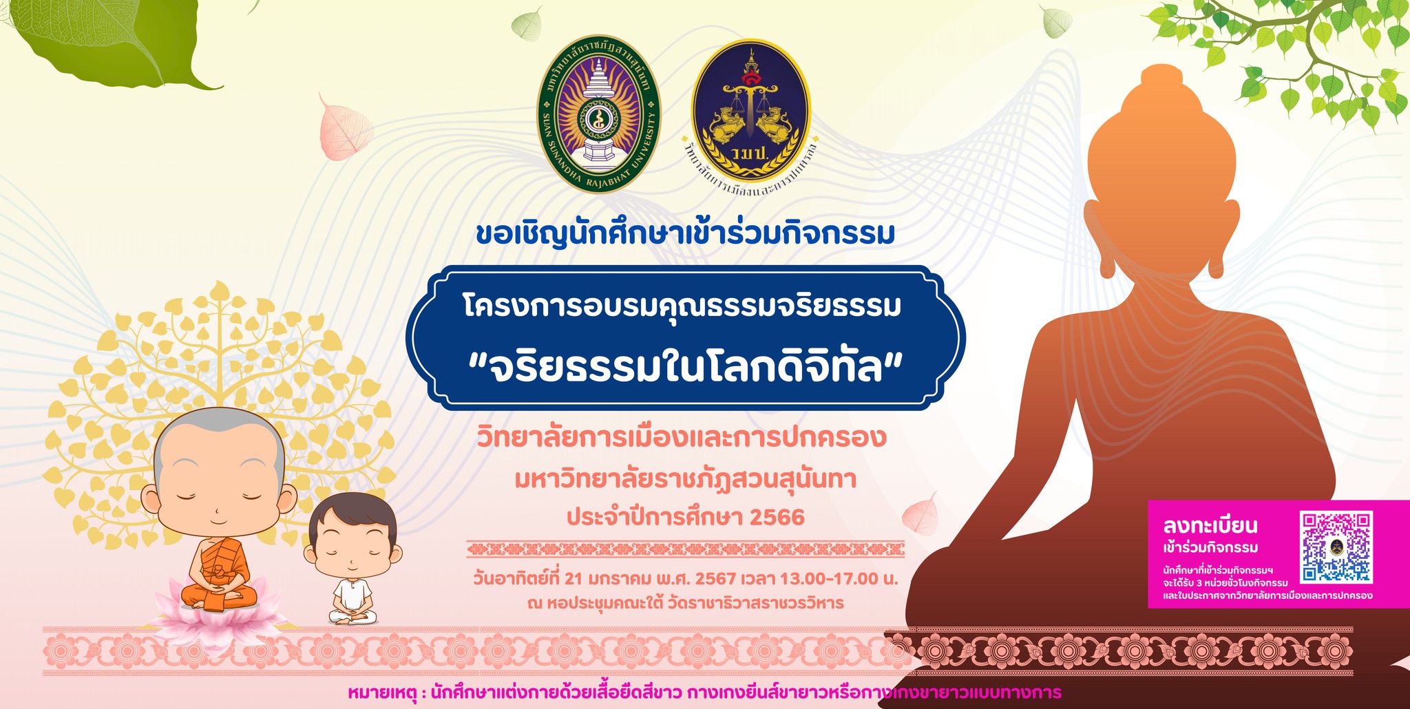 Invite students to join the activity Morality and Ethics Training Project College of Politics and Government Suan Sunandha Rajabhat University Academic year 2023, register to participate in activities at