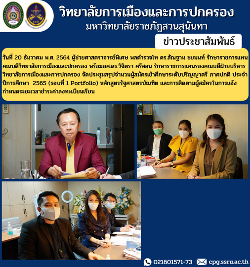 On December 20, 2021, Assistant Professor, Police Lieutenant General Dr. Santhan Chayanon, acting dean of the College of Politics and Administration Prof. Dr. Wichitra Srison, Acting Deputy Dean for Administration College of Politics and Governance Organize a meeting to summarize the number of applicants for bachelor's degree studies, regular term for the academic year 2022 (Round 1 Portfolio) Bachelor of Political Science Program and follow up on applicants in notifying the deadline for payment of tuition fees.