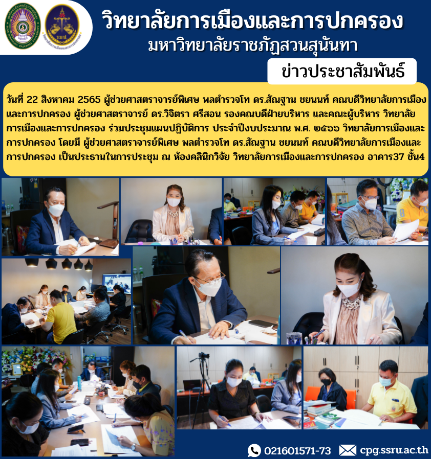 On August 22, 2022, Assistant Professor, Police Lieutenant General Dr. Santhan Chayanon, Dean of the College of Politics and Administration Assistant Professor Dr. Wichitra Srison, Associate Dean for Administration and management College of Politics and Governance join the action plan meeting Fiscal Year 2016, College of Politics and Administration, with Assistant Professor Lt. Gen. Santhan Chayanon, Dean of the College of Politics and Administration presided over the meeting at the research clinic room College of Politics and Administration, Building 37, 45th Floo.