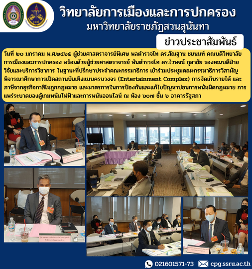 On January 20, 2012, Assistant Professor, Lieutenant General Dr. Santhan Chayanon, Dean of the College of Politics and Administration along with Assistant Professor, Police Lieutenant Colonel Dr. Waiphot Kulachai, Associate Dean for Research and Academic Services. As an advisor to the committee Attending the Extraordinary Commission meeting to consider the opening of a comprehensive entertainment venue (Entertainment Complex) revenue collection and taxes from legal casino business and measures to prevent and solve illegal gambling problems The epidemic of electric gambling machines and online gambling at Room 607, Floor 6, Parliament Building.