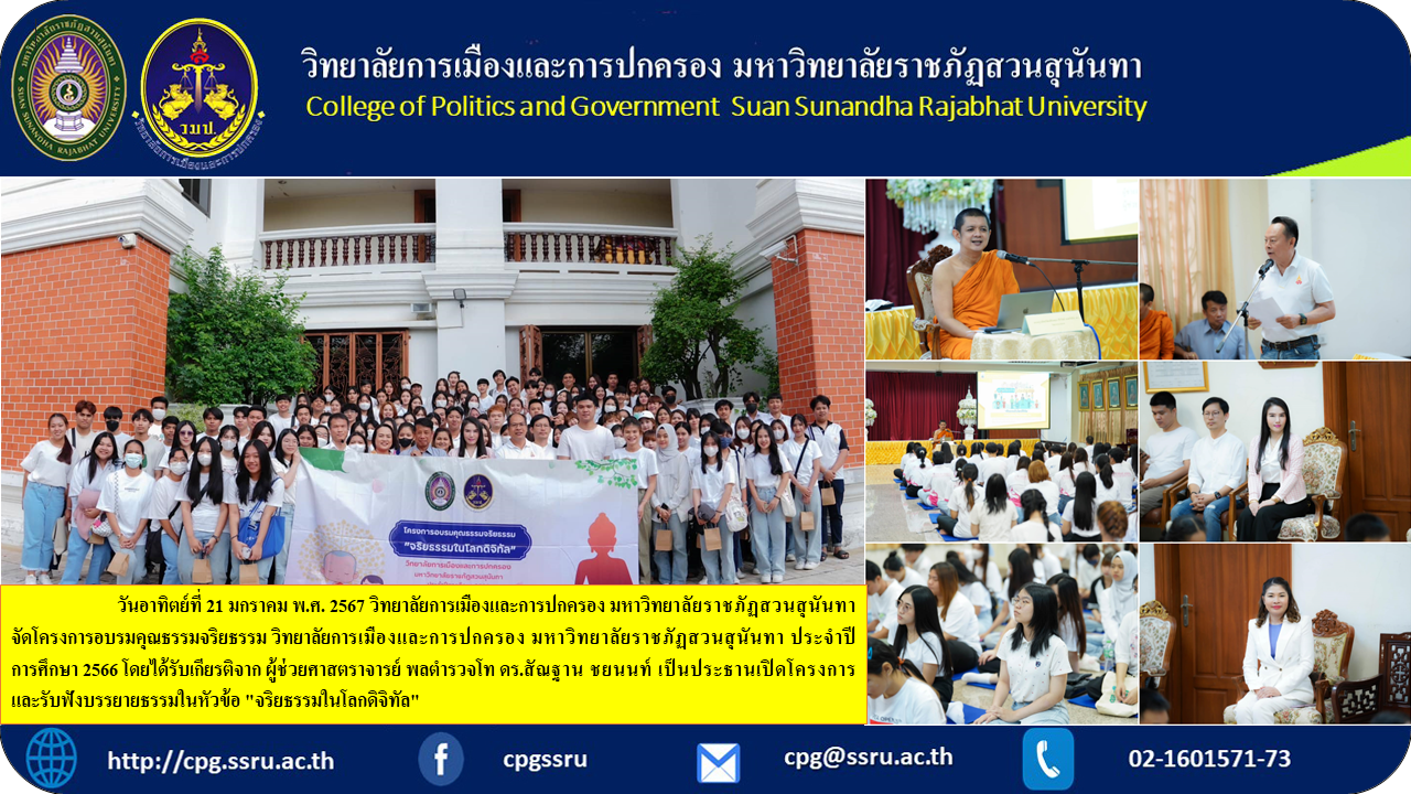 Sunday, January 21, 2024, College of Politics and Government Suan Sunandha Rajabhat University Organize a morality and ethics training project College of Politics and Government Suan Sunandha Rajabhat University Academic year 2023, honored by Assistant Professor Police Lieutenant General Dr. Santhan Chayanont presided over the opening of the project. and listen to Dhamma lectures on the topic "Ethics in the Digital World" from Phrakhru Palad Suwattanasatchakun (Teerawit Chanthawicho, Ph.D.), Assistant Abbot of Wat Rachathiwat Ratchaworawihan, lecturer at Wat Rachathiwat Ratchaworawihan. Bangkok This project received a lot of attention from students. There were more than 150 students from all fields of study participating in the project, organized by the Educational Services Department. College of Politics and Government Suan Sunandha Rajabhat University.