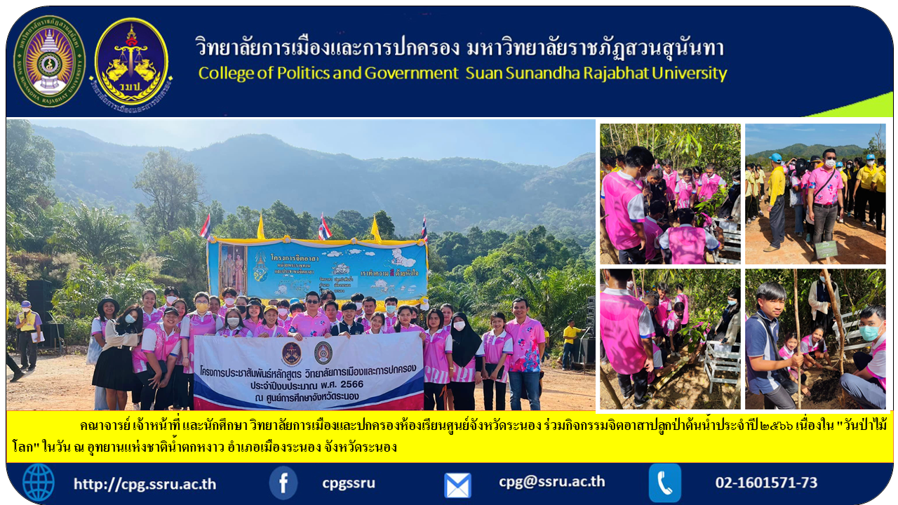 Faculty, staff and students of the College of Politics and Governance, Ranong Center Classroom Participated in a volunteer activity to plant watershed forests for the year 2023 on the occasion of "World Forest Day" on the day at Namtok Ngao National Park. Mueang Ranong District, Ranong Province.