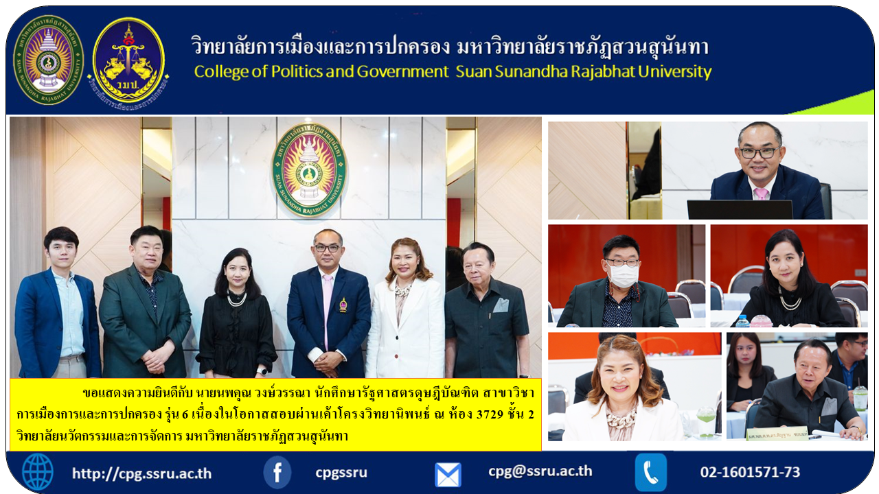 Congratulations to Mr. Noppakhun Wongwanna, Ph.D. Department of Politics and Governance, Class 6 on the occasion of passing the thesis outline at room 3729, 2nd floor, College of Innovation and Management Suan Sunandha Rajabhat University Thank you to the Outline Examination Committee 1. Asst. Prof. Gen. Dr. Morpho Chayanon Chairman of the Examination Committee 2. Asst. Prof. Dr. Wichitra Srisorn Member of the Co-Adviser Committee 3. Assoc. Prof. Dr. Graduate Pan Niran, expert in research methodology and/or statistics 4. Assoc. Prof. Dr. Ravipha Thammachot Specialized Expert 5. Asst. Prof. Dr. Natthapong Techaratanaset Director and secretary that gives feedback to students in order to make student research results more complete.