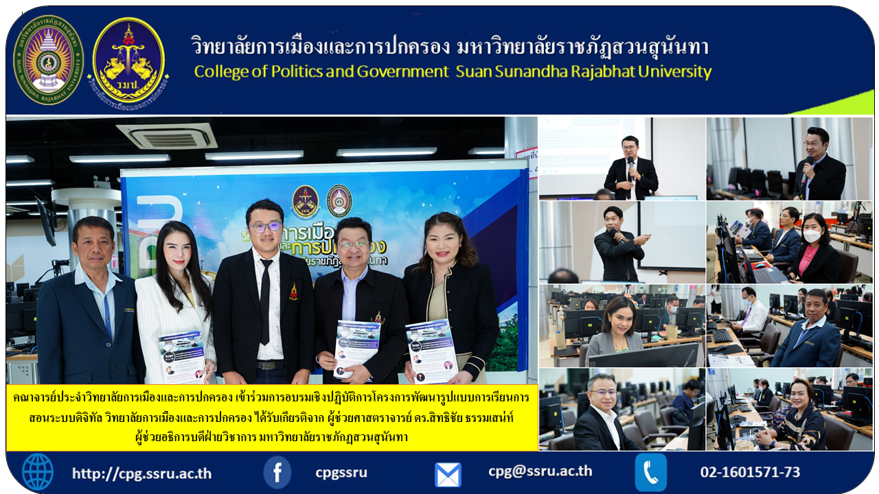 On June 21, 2023, Faculty of Politics and Governance College Participate in the workshop on the development of digital teaching and learning model College of Politics and Governance honored by Assistant Professor Dr. Sitthichai Thammasane, Assistant to the Rector for Academic Affairs Suan Sunandha Rajabhat University Assistant Professor Dr. Thanatchyot Jampawai, Head of Mathematics Department, Faculty of Education, Suan Sunandha Rajabhat University and Assistant Professor Dr. Nattapat Kaewrattanapat Deputy director of e-learning research and innovation Suan Sunandha Rajabhat University, chaired by Assistant Professor Dr. Wichitra Srisorn, Acting Dean of the College of Politics and Government, at Computer Laboratory 3111, 1st Floor, Building 31, Suan Sunandha Rajabhat University.