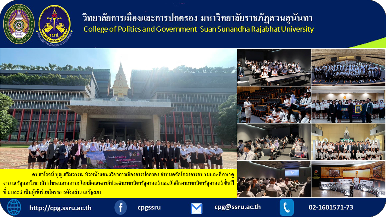 Wednesday, November 22, 2023 Dr. Saroj Bunsermwan, Head of the Political and Governance Department Scheduled to organize a training program and study tour at the Thai Parliament (Sappaya Sabha Sathan), which aims to produce graduates with knowledge, abilities, and skills that are consistent with the Thai economic, social, political, and cultural situation. Including the environment and the global social context. Have the potential to compete in work both domestically and abroad. with faculty members in the political science department and 1st and 2nd year political science students are participants in the said project at Parliament House.