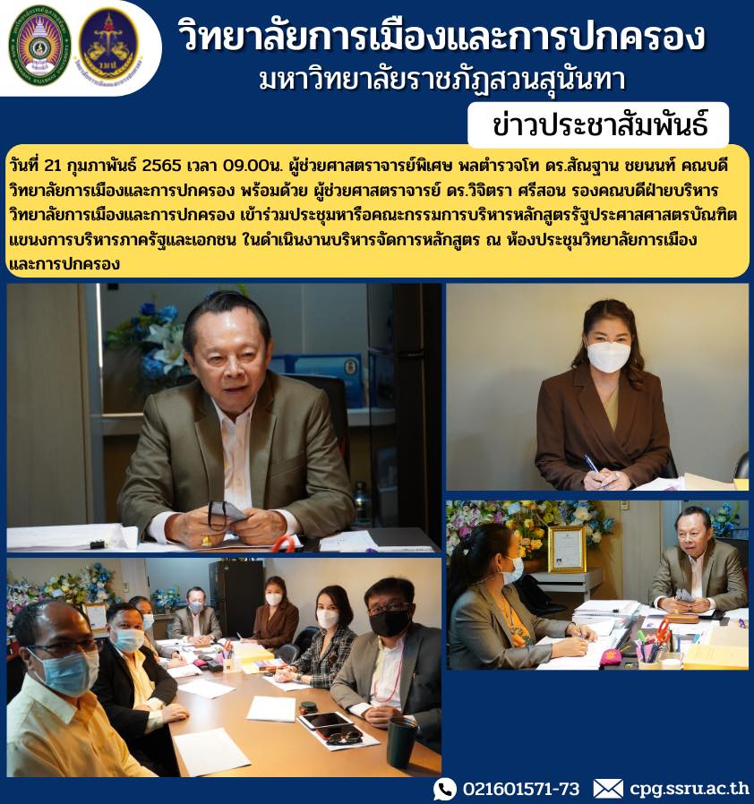 On February 21, 2022 at 9:00 a.m., Assistant Professor Lt. Gen. Santhan Chayanon, Dean of the College of Politics and Administration, together with Assistant Professor Dr. Vichitra Srison, Associate Dean for Administration College of Politics and Governance Attended the meeting to discuss the Board of Directors of the Bachelor of Public Administration Program Public and private administration fields in the course management work at the conference room of the College of Politics and Administration.