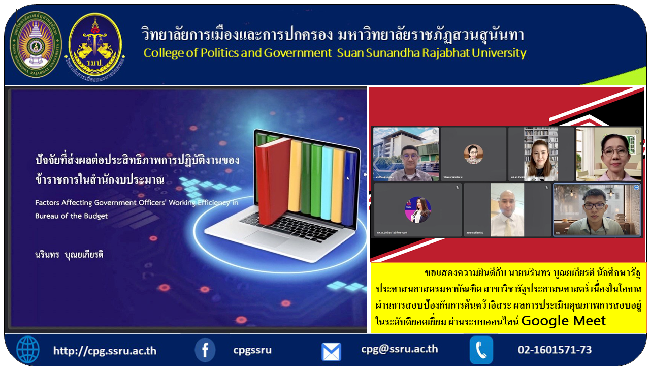 Congratulations to Mr. Narintorn Bunyakiat, Master of Public Administration student. Department of Public Administration on the occasion of passing the Independent Research Defense Examination The results of the assessment of the quality of the examination were in the excellent level. Via Google Meet online system. Thank you to the Independent Research Prevention Examination Committee . 3. Assistant Professor Dr. Suthipong Boonpadung Member and Secretary that gives feedback to students in order to make student research results more complete.