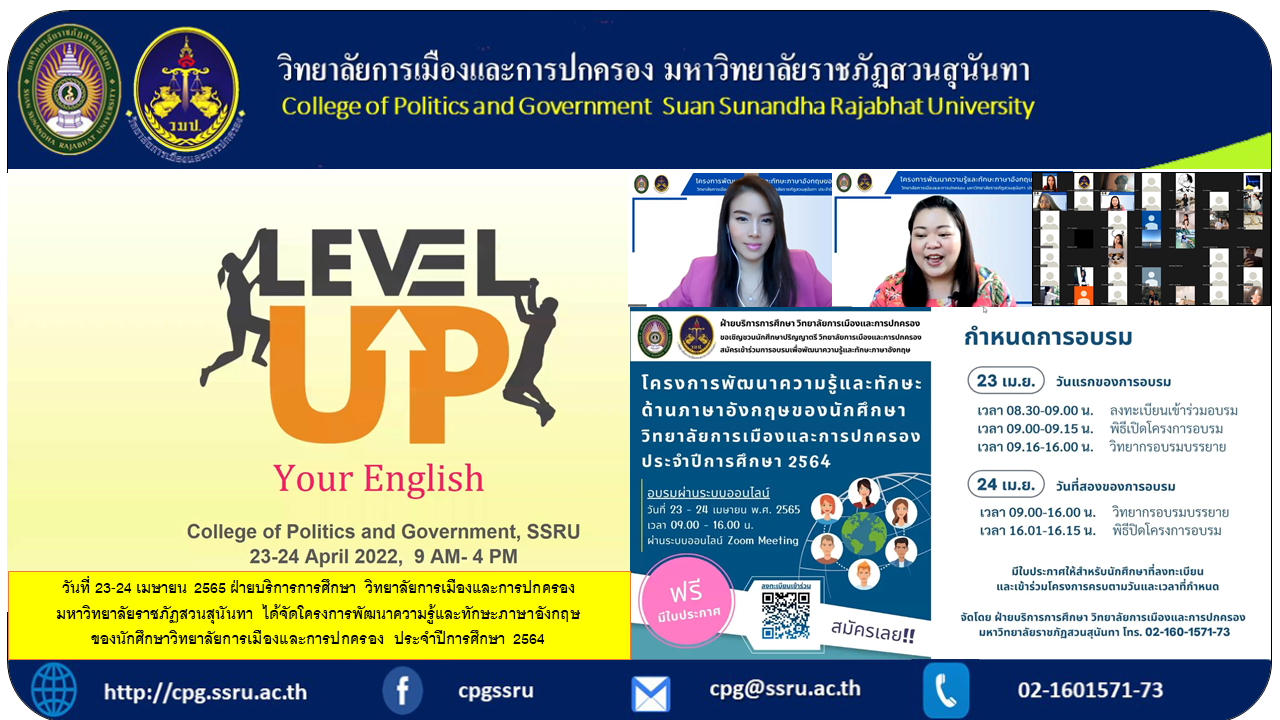 Date 23-24 April 2022 Education Service Department College of Politics and Governance Suan Sunandha Rajabhat University Has organized a project to develop knowledge and English skills of students of the College of Politics and Governance. Academic year 2021 via online system, lectured by Dr. Rattima Tanyathamrongkul, an expert lecturer in English. To develop students' English proficiency It was honored by Professor Dr. Kiratiwan Kalayanamit, Associate Dean for Academic Affairs. College of Politics and Governance presided over the opening remarks of the project. More than 358 students registered to attend the training and showed interest throughout the training.