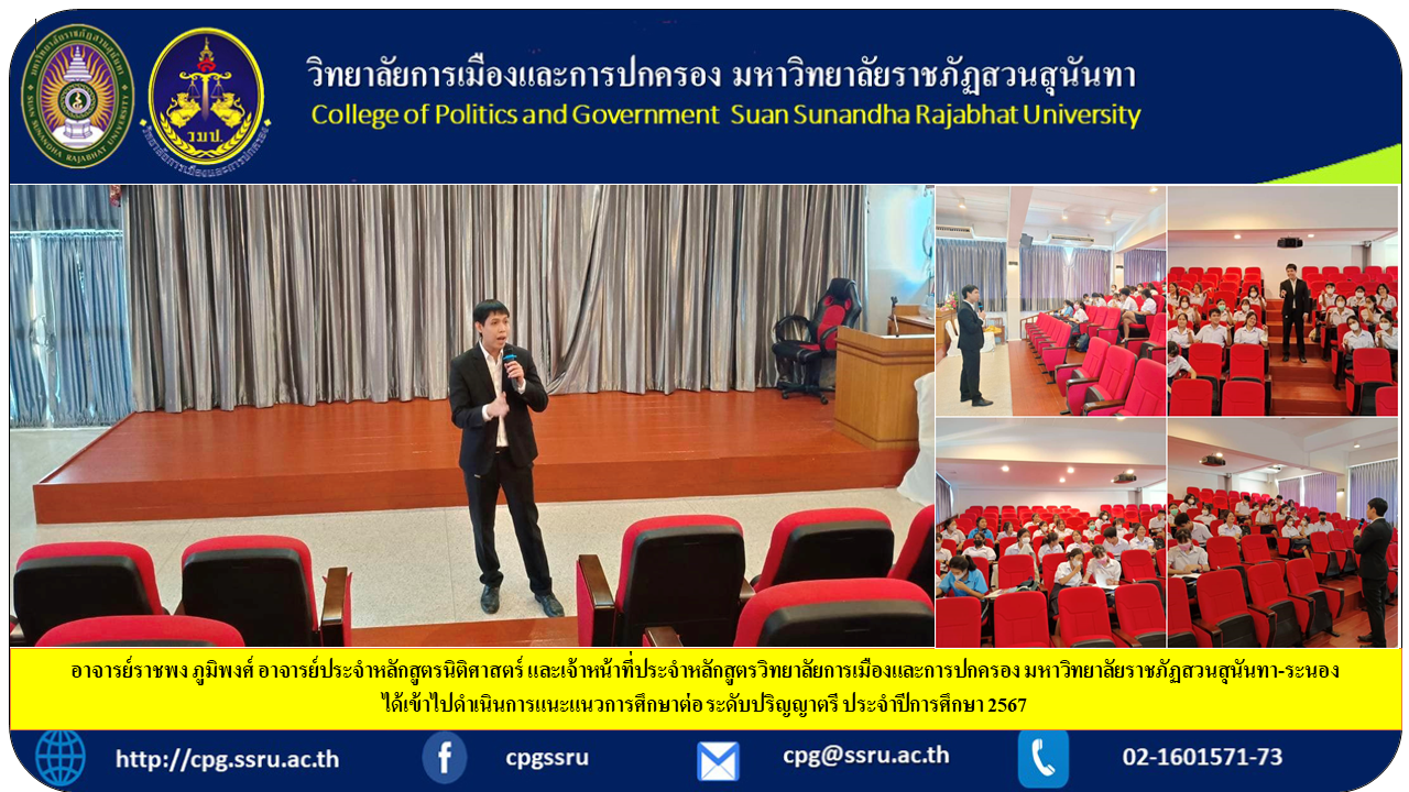 June 23, 2023 at 2:15 PM - 3:15 PM. and course staff at the College of Politics and Government Suan Sunandha Rajabhat University - Ranong went in to conduct further education guidance undergraduate Academic Year 2024 at Satri Ranong School, Ranong Province, with students in Grade 6/8 participating in this event.