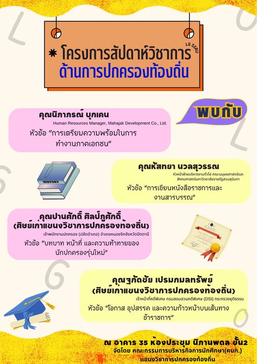 Invite students in the field of local administration and those who are interested to attend lectures under the project "Academic Week in Local Government" on July 1 - 2, 2023, from 8:30 AM to 4:00 PM, at Building 35, Nipanpadol Conference Room, 2nd floor. Meet the local Singha people.