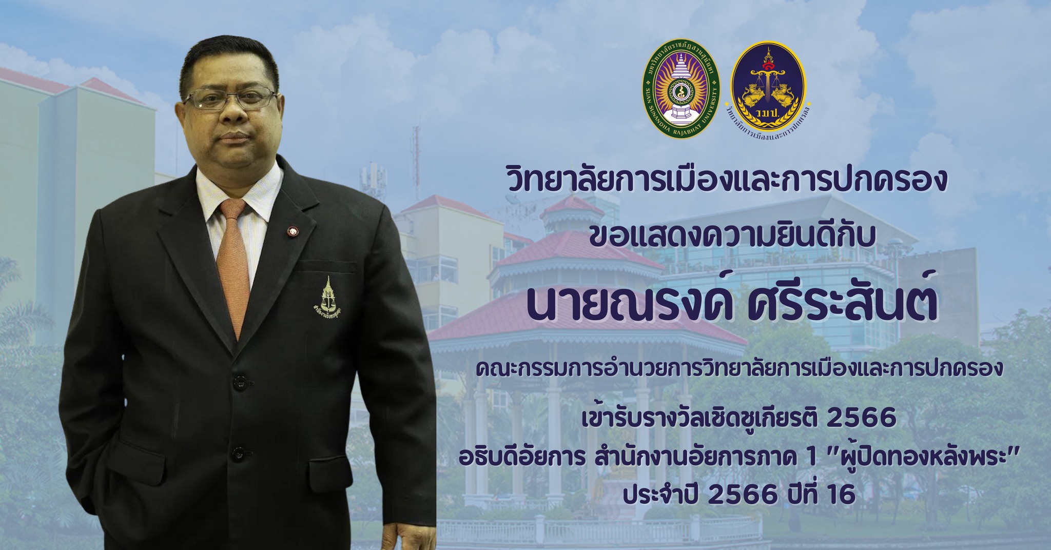 College of Politics and Government Suan Sunandha Rajabhat University Congratulations to Mr. Narong Srirasan, Board of Directors of the College of Politics and Government. Received the Award of Honor 2023, Director General of the Prosecutor's Office Region 1 "Phu Pid Thong Lang Phra" for the year 2023, Year 16.