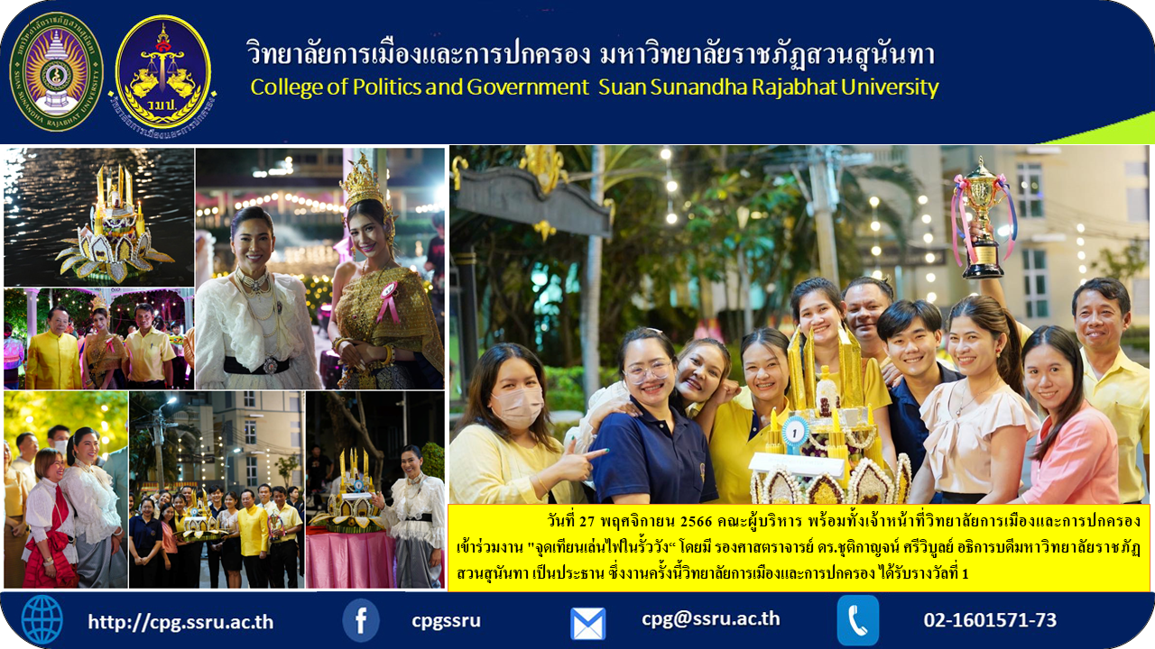 On November 27, 2023, the executive team along with the College of Politics and Governance staff attended the "Candle Lighting and Fire Playing in the Palace Fence" event with Associate Professor. Dr. Chutikarn Sriwiboon, President of Suan Sunandha Rajabhat University, presided over this event at the College of Politics and Government. Received first prize for making a creative krathong at the Faculty of Fine and Applied Arts grounds. Suan Sunandha Rajabhat University.