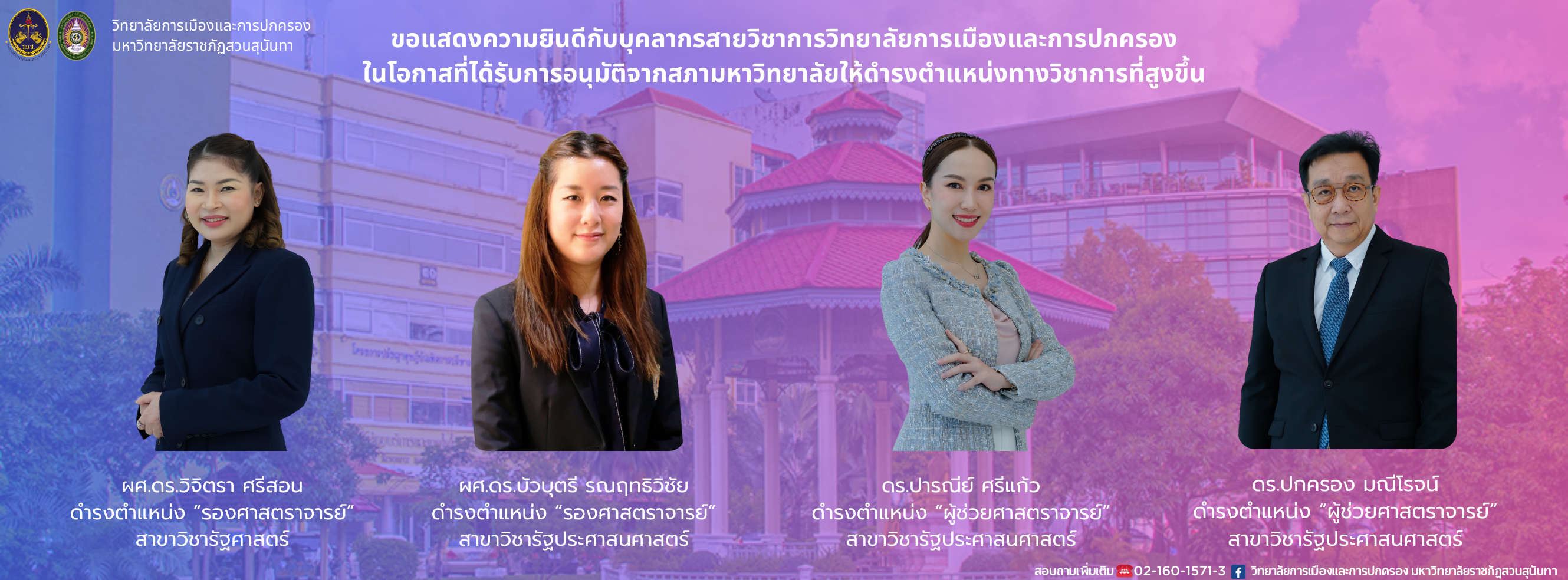 College of Politics and Government Suan Sunandha Rajabhat University Congratulations to the academic staff of the College of Politics and Government. On the occasion of approval by the University Council to hold a higher academic position.
