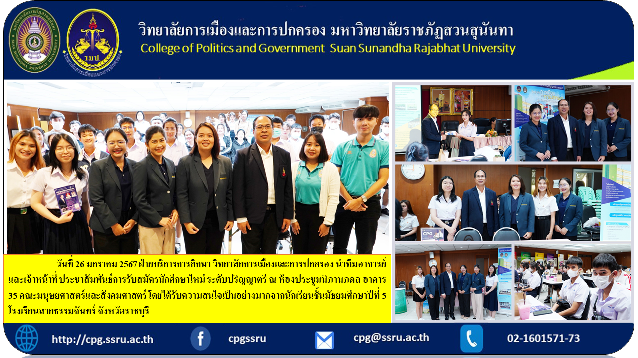 January 26, 2024 Educational Services Department College of Politics and Government Lead a team of teachers and staff Public relations for recruiting new students Bachelor's degree level at Nipanpadon Meeting Room, Building 35, Faculty of Humanities and Social Sciences. It received a lot of attention from Mathayom 5 students at Sai Thamchan School. Ratchaburi Province who came to visit the Faculty of Humanities and Social Sciences and the College of Politics and Government Suan Sunandha Rajabhat University.