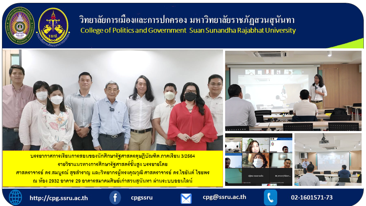 Teaching atmosphere of Doctorate of Political Science students, semester 3/2021, Course Guidelines for Advanced Political Science Education, lectured by Professor Dr. Somboon Suksamran and qualified lecturer, Professor Dr. Chaiyan Chaiyaphorn at Room 2932, Building 29, Suan Sunandha Alumni Association Building.