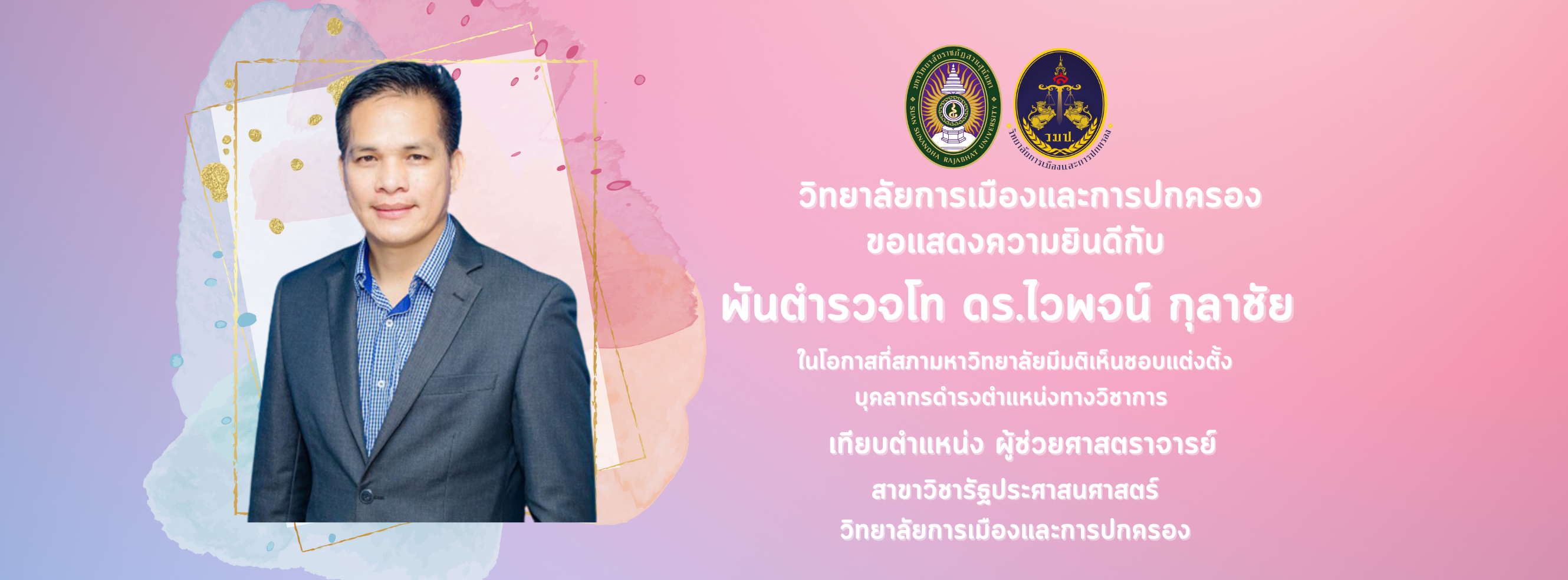College of Politics and Governance Congratulations to Police Lieutenant Colonel Dr. Waiphot Kulachai on the occasion of the University Council's resolution approving the appointment of personnel. Holds an academic position, equivalent to the position of Assistant Professor Department of Public Administration College of Politics and Governance.