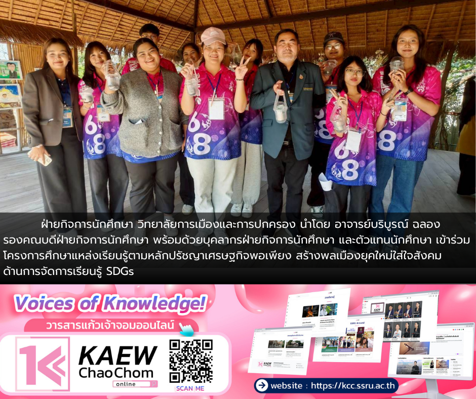 วันที่ 2 กุมภาพันธ์ 2569 ฝ่ายกิจการนักศึกษา วิทยาลัยการเมืองและการปกครอง นำโดย อาจารย์บริบูรณ์ ฉลอง รองคณบดีฝ่ายกิจการนักศึกษา พร้อมด้วยบุคลากรฝ่ายกิจการนักศึกษา และตัวแทนนักศึกษา เข้าร่วม โครงการศึกษาแหล่งเรียนรู้ตามหลักปรัชญาเศรษฐกิจพอเพียง สร้างพลเมืองยุคใหม่ใส่ใจสังคม ด้านการจัดการเรียนรู้ตามเป้าหมายการพัฒนาที่ยั่งยืน (SDGs) ณ ศูนย์การเรียนรู้เศรษฐกิจพอเพียงบ้านของพ่อ จังหวัดพระนครศรีอยุธยาภายในกิจกรรม ผู้เข้าร่วมได้เปิดประสบการณ์การเรียนรู้นอกห้องเรียนผ่านกระบวนการเรียนรู้เชิงปฏิบัติ อาทิ การเรียนรู้ภูมิปัญญาท้องถิ่นจากปราชญ์ชาวบ้าน การออกแบบและพัฒนาพื้นที่แหล่งเรียนรู้เพื่อความยั่งยืน การลงมือปฏิบัติจริงกับกิจกรรมปลูกข้าว