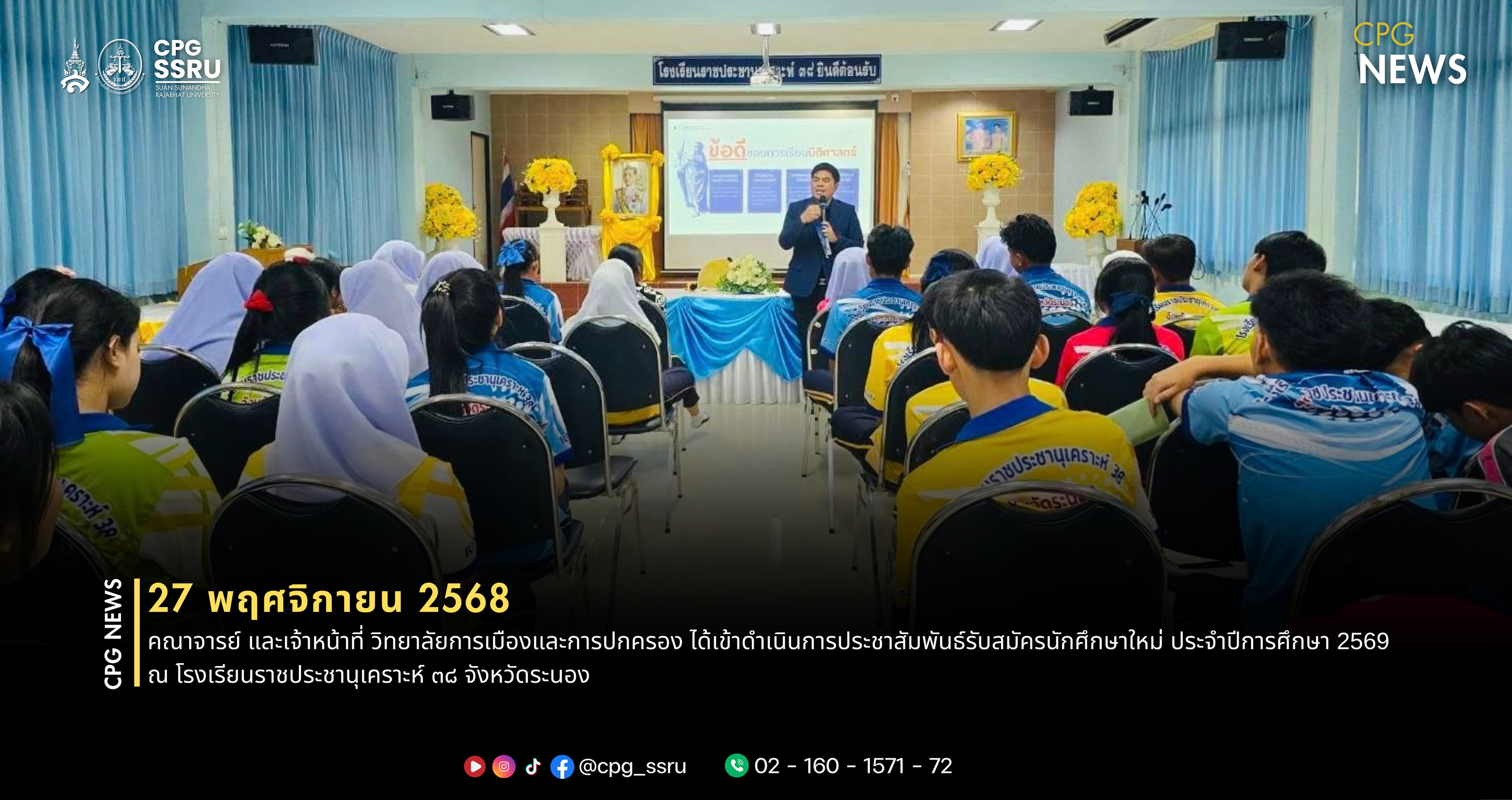 วันพฤหัสบดีที่ 27 พฤศจิกายน พ.ศ. 2568 เวลา 14:30 - 15.20 น. คณาจารย์ และเจ้าหน้าที่ วิทยาลัยการเมืองและการปกครอง ได้เข้าดำเนินการประชาสัมพันธ์รับสมัครนักศึกษาใหม่ ประจำปีการศึกษา 2569 ณ โรงเรียนราชประชานุเคราะห์ ๓๘ จังหวัดระนอง นำโดย อาจารย์ภูชิชย์ ภูริสิริกุล อาจารย์ประจำสาขาวิชานิติศาสตร์ อาจารย์พรรรัศน์ ทิวนาถ อาจารย์พิเศษประจำสาขาวิชารัฐศาสตร์ ร่วมด้วยเจ้าหน้าที่ประจำวิทยาลัย นางสาวกัณฐมณี อ่างทอง เจ้าหน้าที่บริหารงานทั่วไป