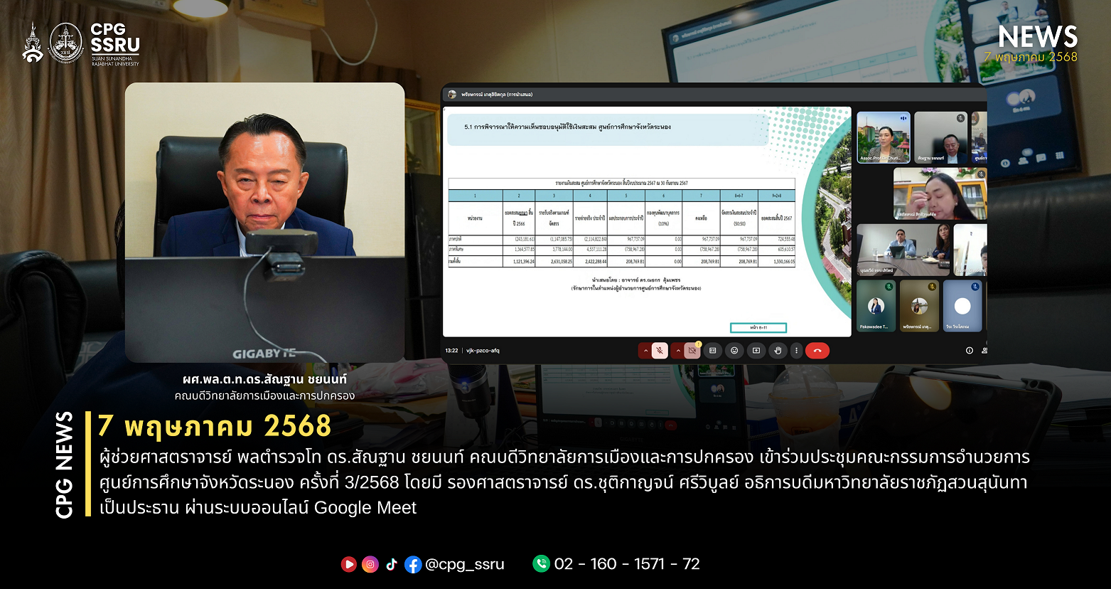 วัันที่ 7 พฤษภาคม 2568 ผู้ช่วยศาสตราจารย์ พลตำรวจโท ดร.สัณฐาน ชยนนท์ คณบดีวิทยาลัยการเมืองและการปกครอง เข้าร่วมประชุมคณะกรรมการอำนวยการศูนย์การศึกษาจังหวัดระนอง ครั้งที่ 3/2568 โดยมี รองศาสตราจารย์ ดร.ชุติกาญจน์ ศรีวิบูลย์ อธิการบดีมหาวิทยาลัยราชภัฏสวนสุนันทา เป็นประธาน ผ่านระบบออนไลน์ Google Meet