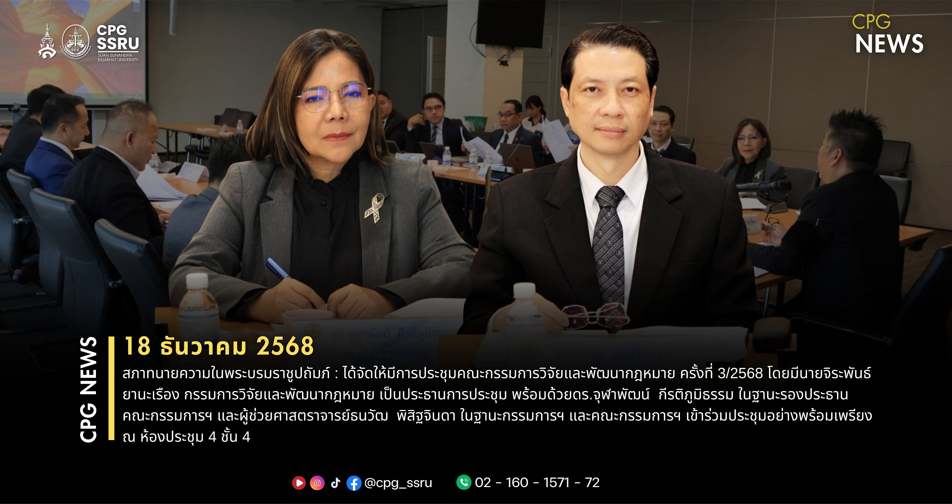 เมื่อวันที่ 18 ธันวาคม 2568 เวลา 13.00 น. ณ ห้องประชุม 4 ชั้น 4 สภาทนายความในพระบรมราชูปถัมภ์ : ได้จัดให้มีการประชุมคณะกรรมการวิจัยและพัฒนากฎหมาย ครั้งที่ 3/2568 โดยมีนายจิระพันธ์ ยานะเรือง กรรมการวิจัยและพัฒนากฎหมาย เป็นประธานการประชุม พร้อมด้วยดร.จุฬาพัฒน์  กีรติภูมิธรรม ในฐานะรองประธานคณะกรรมการฯ และผู้ช่วยศาสตราจารย์ธนวัฒ  พิสิฐจินดา ในฐานะกรรมการฯ (อาจารย์ประจำวิทยาลัยการเมืองและการปกครอง มหาวิทยาลัยราชภัฏสวนสุนันทา) และคณะกรรมการฯ เข้าร่วมประชุมอย่างพร้อมเพรียง โดยที่ประชุมได้มีการพิจารณาแผนนโยบาย วิสัยทัศน์ พันธกิจ ยุทธศาสตร์ในการดำเนินงาน 5 ปี พ.ศ. 2568-2572 และจัดทำแผนดำเนินงาน (Timeline) ในการแก้ไขร่างพระราชบัญญัติทนายความ พ.ศ.2528 ฉบับที่ 6 เพื่อให้เกิดประโยชน์สูงสุดแก่สมาชิกทนายความและประชาชน