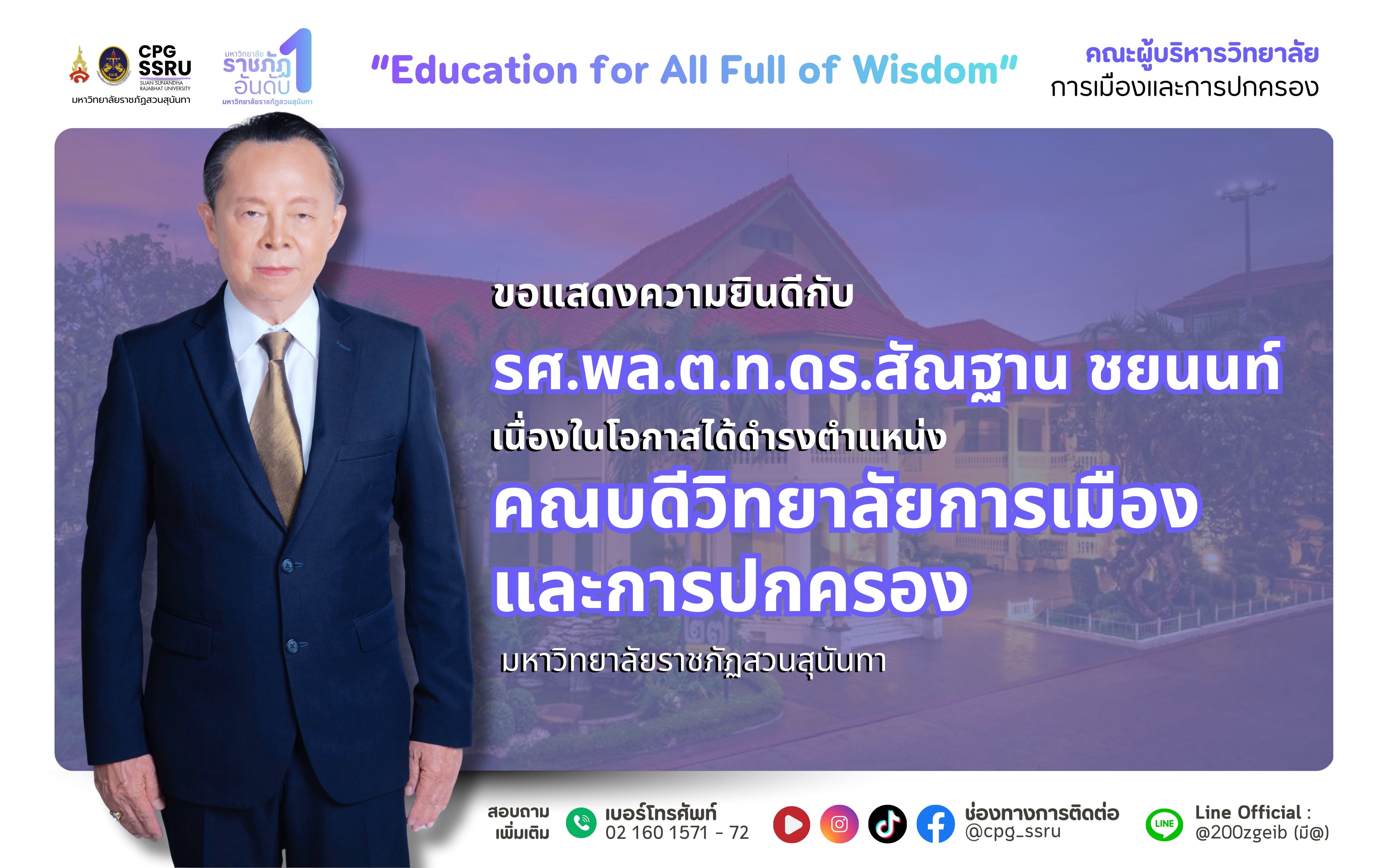 วิทยาลัยการเมืองและการปกครอง ขอแสดงความยินดีกับ รองศาสตราจารย์ พลตำรวจโท ดร.สัณฐาน ชยนนท์ เนื่องในโอกาสได้รับการแต่งตั้งให้ดำรงตำแหน่ง คณบดีวิทยาลัยการเมืองและการปกครอง มหาวิทยาลัยราชภัฏสวนสุนันทา