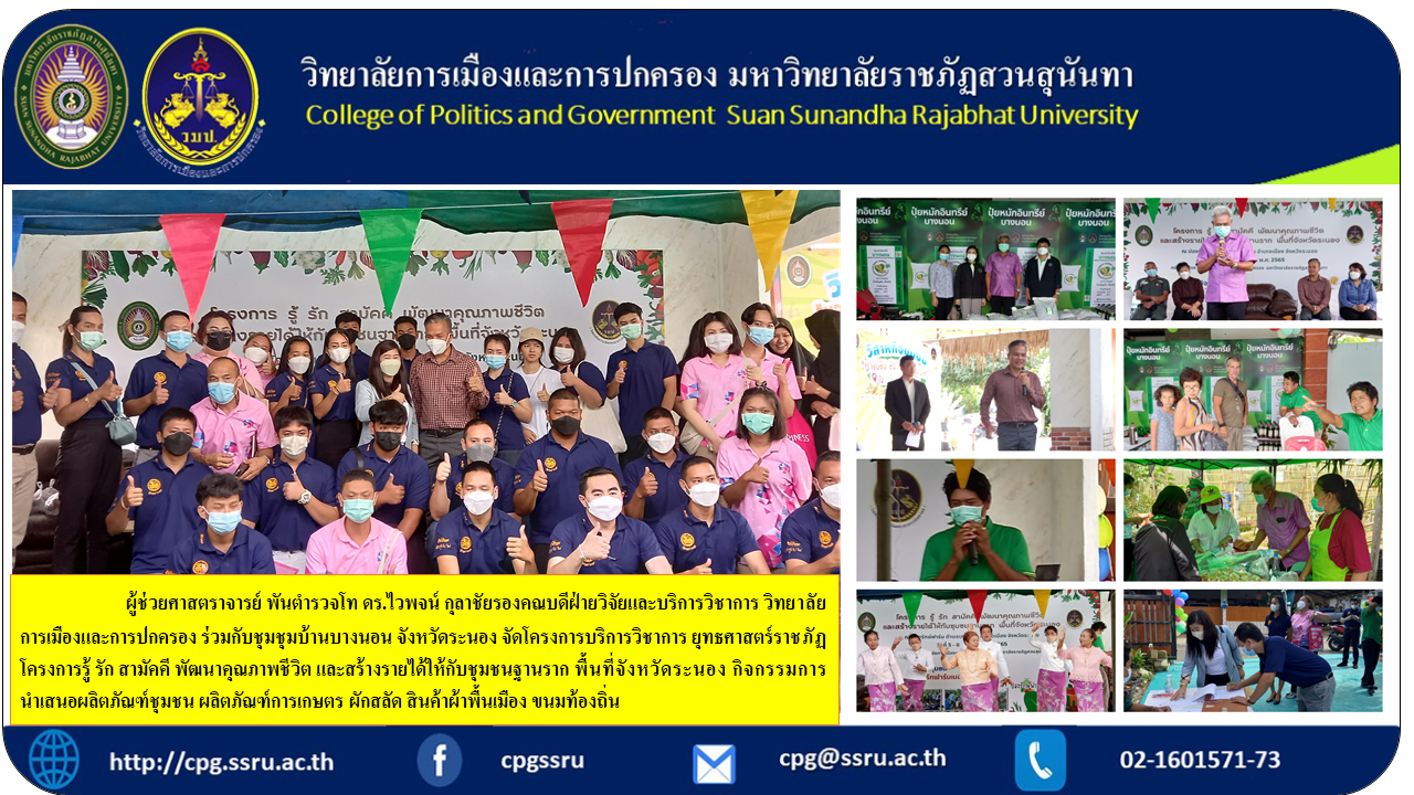 วันที่ 6 สิงหาคม 2565 ผู้ช่วยศาสตราจารย์ พันตำรวจโท ดร.ไวพจน์ กุลาชัยรองคณบดีฝ่ายวิจัยและบริการวิชาการ วิทยาลัยการเมืองและการปกครอง ร่วมกับชุมชุมบ้านบางนอน จังหวัดระนอง จัดโครงการบริการวิชาการ ยุทธศาสตร์ราชภัฏ โครงการรู้ รัก สามัคคี พัฒนาคุณภาพชีวิต และสร้างรายได้ให้กับชุมชนฐานราก พื้นที่จังหวัดระนอง กิจกรรมการนำเสนอผลิตภัณฑ์ชุมชน ผลิตภัณฑ์การเกษตร ผักสลัด สืนค้าผ้าพื้นเมือง ขนมท้องถิ่น เป็นต้น โดยได้รับเกียรติ จาก นายอำนวย แออุดม เกษตรจังหวัดระนอง เป็นประธานเปิดโครงการ พร้อมด้วยประธานชุมชนวิสาหกิจ นักธุรกิจจังหวัดระนอง คุณรุ่งระพี มหพันธุ์ทิพย์ กิจกรรม มีชุมชนออกบูธจำหน่ายสินค้า และแนะนำการผลิตสินค้าและมีการบูรณาการกับการเรียนการสอน โดยอาจารย์ ในหลักสูตรรัฐศาตร์ปริญญาตรี นำนักศึกษาเข้าร่วมงาน นำแนวทฤษฎีสู่การปฏิบัติ และนักศึกษาที่กำลังศึกษาปริญญาเอก วิทยาลัยการเมืองและการปกครอง เข้าร่วมโครงการ เพื่อต่อยอดให้ชุมชนสูาเชิงพาณิชย์ ณ ปองรักษ์ฟาร์ม ชุมชนบ้านบางนอน จังหวัดระนอง