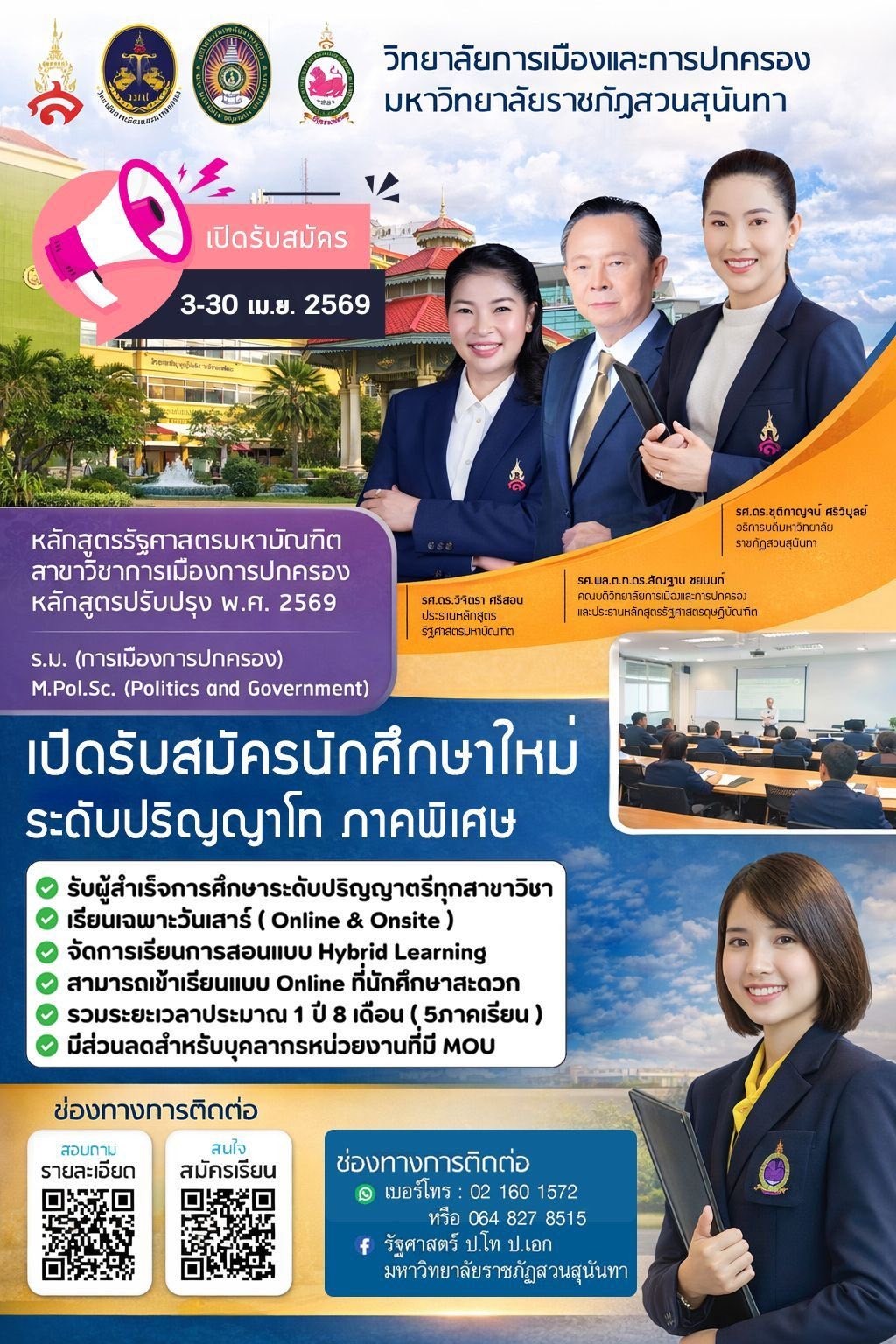วิทยาลัยการเมืองและการปกครอง มหาวิทยาลัยราชภัฏสวนสุนันทา เปิดรับสมัครนักศึกษาใหม่ ระดับบัณฑิตศึกษา ประจำปีการศึกษา 2569 หลักสูตรรัฐศาสตรมหาบัณฑิต สาขาวิชาการเมืองการปกครอง ตั้งแต่วันที่ 3 - 30 เม.ย. 2569 คลิกสมัคร https://admission.ssru.ac.th/