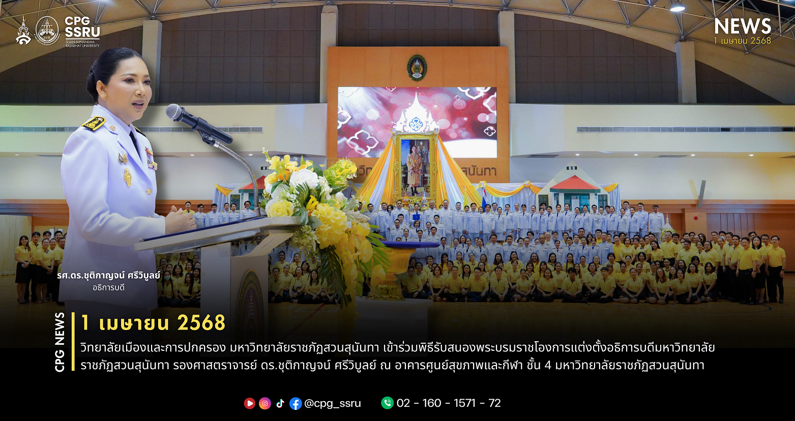 วันที่ 1 เมษายน 2568 วิทยาลัยการเมืองและการปกครอง มหาวิทยาลัยราชภัฏสวนสุนันทา นำโดยคณบดี คณะผู้บริหาร คณาจารย์ และเจ้าหน้าที่ เข้าร่วมพิธีรับสนองพระบรมราชโองการแต่งตั้ง รองศาสตราจารย์ ดร.ชุติกาญจน์ ศรีวิบูลย์ เป็นอธิการบดี ณ อาคารศูนย์สุขภาพและกีฬา