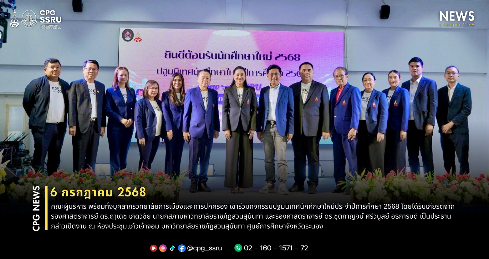 วันที่ 6 กรกฎาคม 2568 คณะผู้บริหาร พร้อมทั้งบุคลากรวิทยาลัยการเมืองและการปกครอง เข้าร่วมกิจกรรมปฐมนิเทศนักศึกษาใหม่ประจำปีการศึกษา 2568 โดยได้รับเกียรติจาก รองศาสตราจารย์ ดร.ฤๅเดช เกิดวิชัย นายกสภามหาวิทยาลัยราชภัฏสวนสุนันทา และรองศาสตราจารย์ ดร.ชุติกาญจน์ ศรีวิบูลย์ อธิการบดี เป็นประธานกล่าวเปิดงานและได้รับเกียรติจาก ผู้ช่วยศาสตราจารย์ ดร.คมสัน โสมณวัตร รองอธิการบดีฝ่ายบริหาร และคณะผู้บริหารมหาวิทยาลัยราชภัฏสวนสุนันทา กล่าวต้อนรับนักศึกษาใหม่เข้าสู่รั้วมหาวิทยาลัย ณ ห้องประชุมแก้วเจ้าจอม มหาวิทยาลัยราชภัฏสวนสุนันทา ศูนย์การศึกษาจังหวัดระนอง