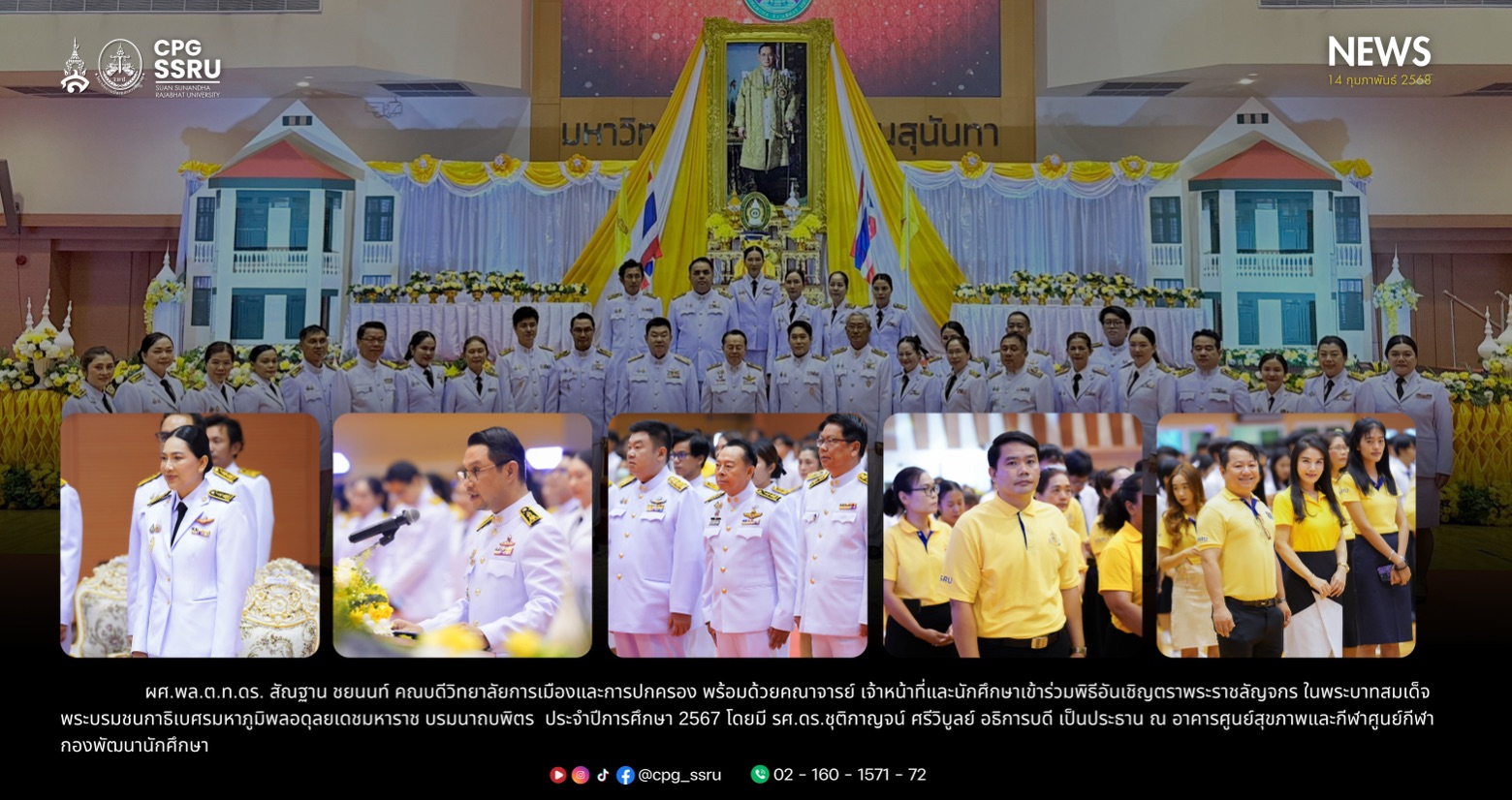 วันศุกร์ ที่ 14 กุมภาพันธ์ 2568 เวลา 9.30 น ผู้ช่วยศาสตราจารย์ พลตำรวจโท ดร. สัณฐาน ชยนนท์ คณบดีวิทยาลัยการเมืองและการปกครอง พร้อมด้วยคณาจารย์ เจ้าหน้าที่และนักศึกษาเข้าร่วมพิธีอันเชิญตราพระราชลัญจกร ในพระบาทสมเด็จพระบรมชนกาธิเบศรมหาภูมิพลอดุลยเดชมหาราช บรมนาถบพิตร ประจำปีการศึกษา 2567 โดยมี รองศาสตราจารย์ ดร.ชุติกาญจน์ ศรีวิบูลย์ อธิการบดี เป็นประธาน ณ อาคารศูนย์สุขภาพและกีฬาศูนย์กีฬา กองพัฒนานักศึกษา