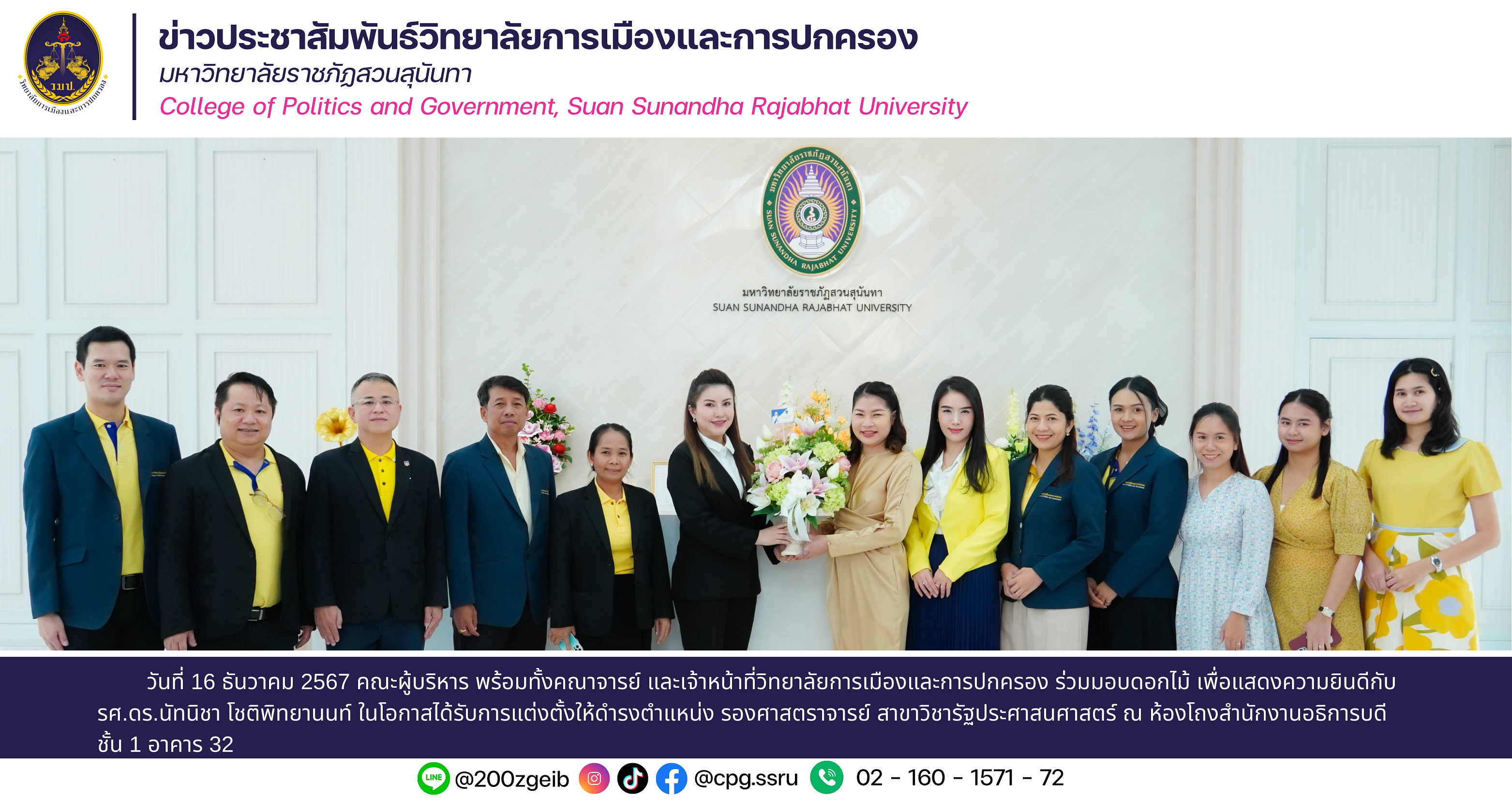 วันที่ 16 ธันวาคม 2567 คณะผู้บริหาร พร้อมทั้งคณาจารย์ และเจ้าหน้าที่วิทยาลัยการเมืองและการปกครอง ร่วมมอบดอกไม้ เพื่อแสดงความยินดีกับ รศ.ดร.นัทนิชา โชติพิทยานนท์ ในโอกาสได้รับการแต่งตั้งให้ดำรงตำแหน่ง รองศาสตราจารย์ สาขาวิชารัฐประศาสนศาสตร์ ณ ห้องโถงสำนักงานอธิการบดี ชั้น 1 อาคาร 32