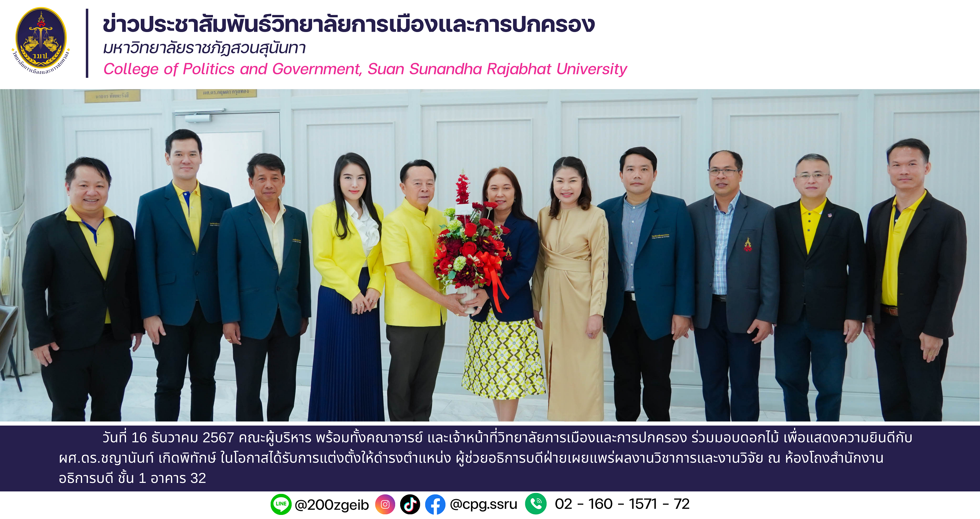 วันที่ 16 ธันวาคม 2567 คณะผู้บริหาร พร้อมทั้งคณาจารย์ และเจ้าหน้าที่วิทยาลัยการเมืองและการปกครอง ร่วมมอบดอกไม้ เพื่อแสดงความยินดีกับ ผศ.ดร.ชญานันท์ เกิดพิทักษ์ ในโอกาสได้รับการแต่งตั้งให้ดำรงตำแหน่ง ผู้ช่วยอธิการบดีฝ่ายเผยแพร่ผลงานวิชาการและงานวิจัย ณ ห้องโถงสำนักงานอธิการบดี ชั้น 1 อาคาร 32