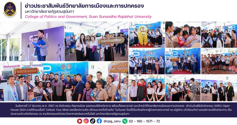 วันอังคารที่ 17 ธันวาคม พ.ศ. 2567 ผู้ช่วยศาสตราจารย์ พลตำรวจโท ดร.สัณฐาน ชยนนท์ คณบดีวิทยาลัยการเมืองและการปกครอง มอบหมายให้ ดร.กีรติวรรณ กัลยาณมิตร รองคณบดีฝ่ายวิชาการ พร้อมทั้งคณาจารย์ และเจ้าหน้าที่วิทยาลัยการเมืองและการปกครอง เข้าร่วมในพิธีเปิดกิจกรรม SSRU Open House 2024 ภายใต้คอนเซ็ปต์ “Unlock Your Mind ปลดล็อกความคิด สร้างอนาคตไปด้วยกัน” ในวันแรก โดยได้รับเกียรติจาก ผู้ช่วยศาสตราจารย์ ดร.ณัฐภัทร แก้วรัตนภัทร์ รองอธิการบดีฝ่ายวิชาการ เป็นประธานกล่าวเปิดกิจกรรม ณ ลานกิจกรรมหน้าคณะวิทยาศาสตร์และเทคโนโลยี มหาวิทยาลัยราชภัฏสวนสุนันทา