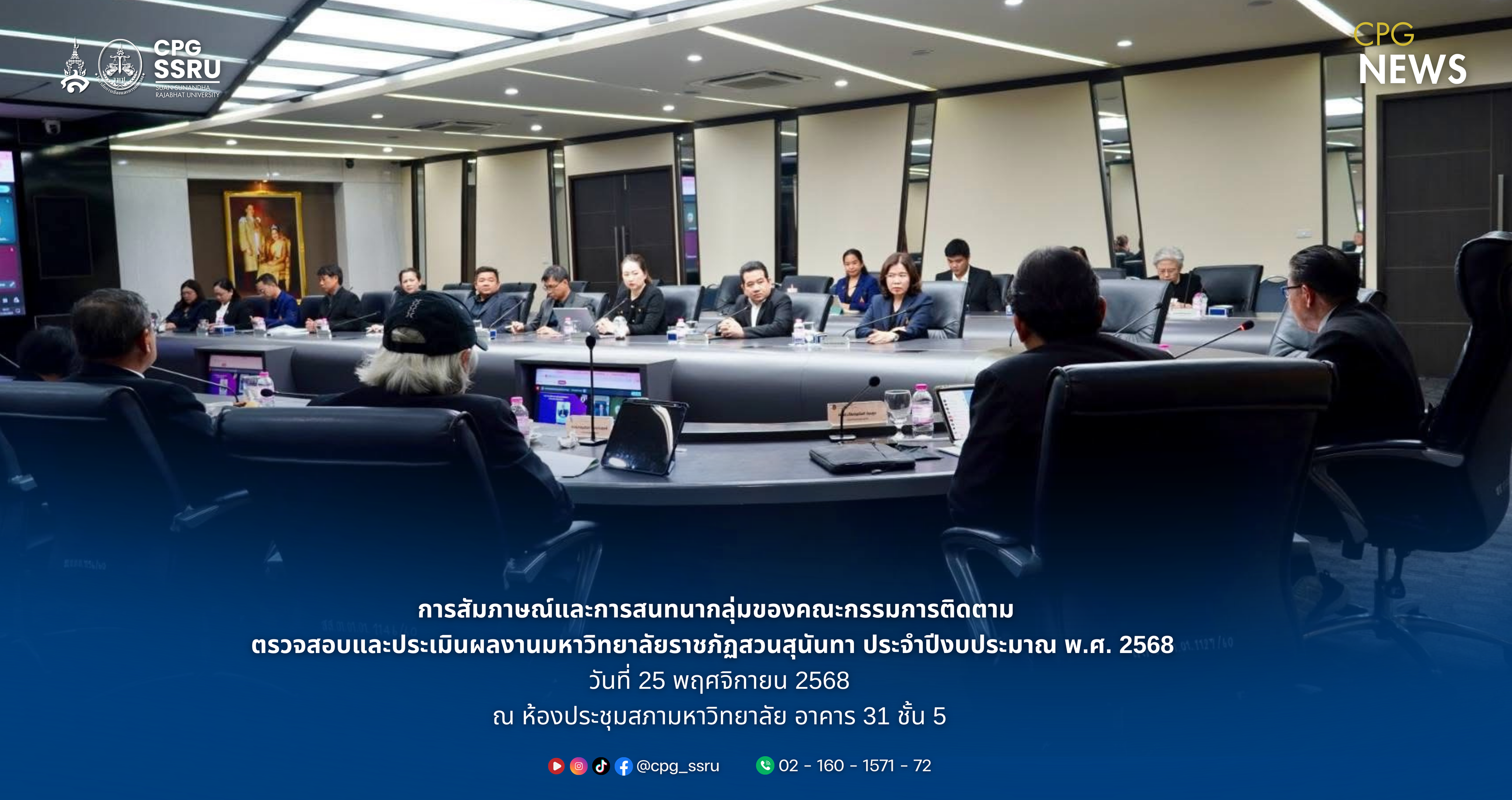 วันที่ 25 พฤศจิกายน 2568 ผู้ช่วยศาสตราจารย์ พลตำรวจโท ดร.สัณฐาน ชยนนท์ คณบดีวิทยาลัยการเมืองและการปกครอง มอบหมายให้ ผู้ช่วยศาสตราจารย์ ดร.จักรวาล สุขไมตรี รองคณบดีฝ่ายแผนงานและประกันคุณภาพ เข้าร่วมการสัมภาษณ์และการสนทนากลุ่มของคณะกรรมการติดตาม ตรวจสอบและประเมินผลงานมหาวิทยาลัยราชภัฏสวนสุนันทา ประจำปีงบประมาณ พ.ศ. 2568 ณ ห้องประชุมสภามหาวิทยาลัย อาคาร 31 ชั้น 5