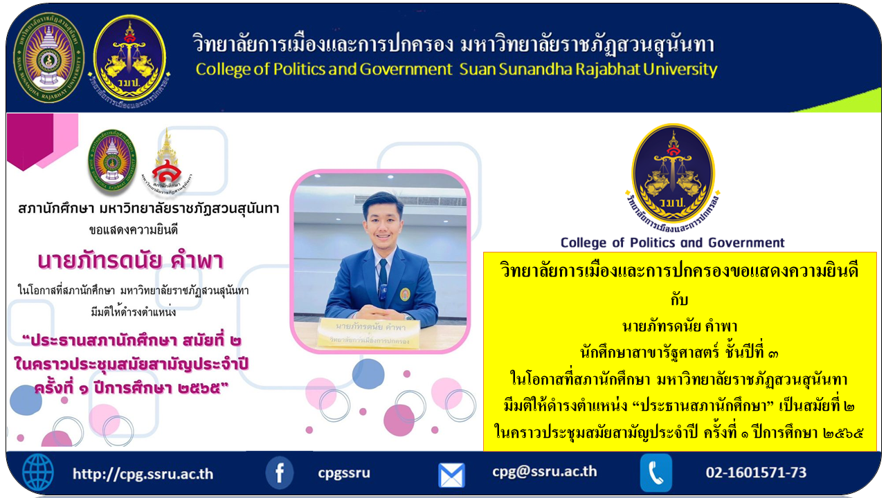 วิทยาลัยการเมืองและการปกครองขอแสดงความยินดี กับ นายภัทรดนัย คำพา นักศึกษาสาขารัฐศาสตร์ ชั้นปีที่ ๓ ในโอกาสที่สภานักศึกษา มหาวิทยาลัยราชภัฏสวนสุนันทา มีมติให้ดำรงตำแหน่ง “ประธานสภานักศึกษา” เป็นสมัยที่ ๒ ในคราวประชุมสมัยสามัญประจำปี ครั้งที่ ๑ ปีการศึกษา ๒๕๖๕