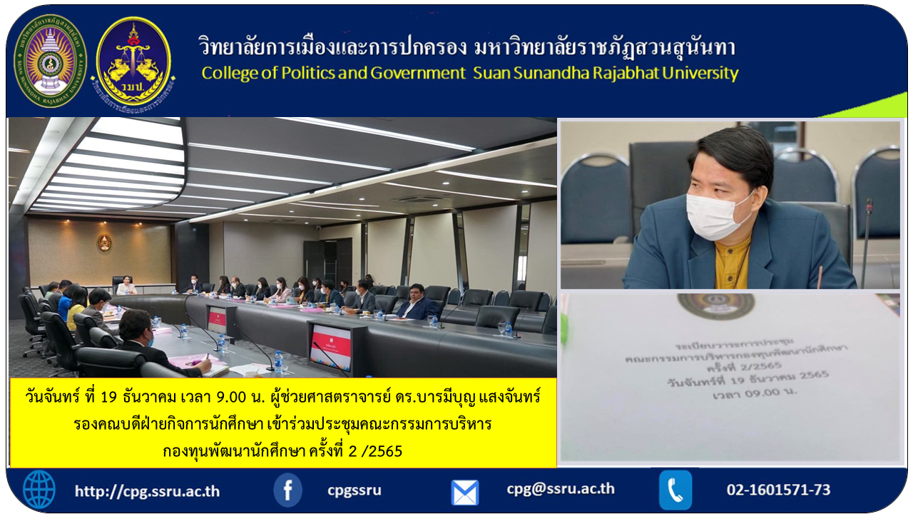 วันจันทร์ ที่ 19 ธันวาคม เวลา 9.00 น. ผู้ช่วยศาสตราจารย์ ดร.บารมีบุญ แสงจันทร์ รองคณบดีฝ่ายกิจการนักศึกษา เข้าร่วมประชุมคณะกรรมการบริหารกองทุนพัฒนานักศึกษา ครั้งที่ 2 /2565 ณ.ห้องประชุมสภามหาวิทยาลัย อาคาร 31 ชั้น 1 โดยมี รองศาสตราจารย์ ดร.ชุติกาญจน์ ศรีวิบูลย์ อธิการบดีเป็นประธาน