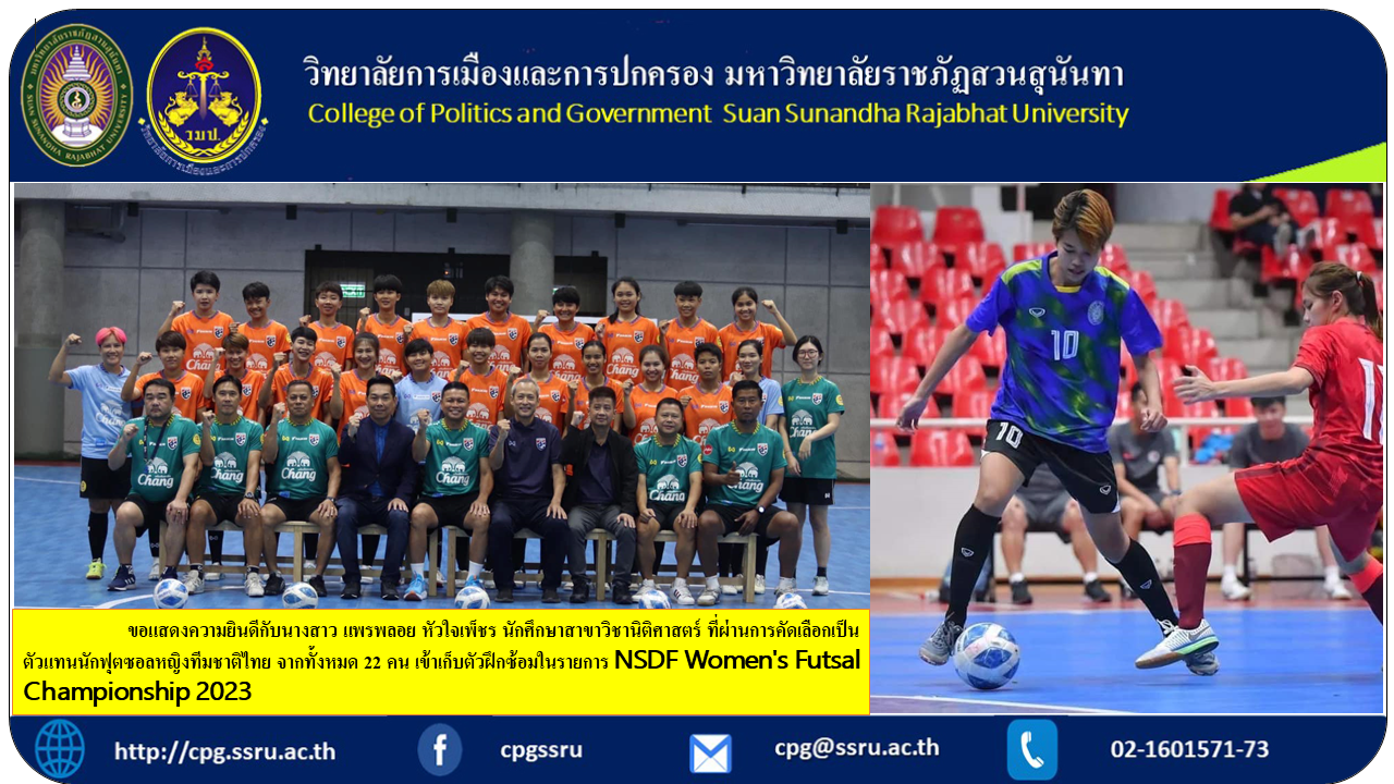 ฝ่ายกิจการนักศึกษาและสโมสรนักศึกษาขอแสดงความยินดีกับนางสาว แพรพลอย หัวใจเพ็ชร นักศึกษาสาขาวิชานิติศาสตร์ ที่ผ่านการคัดเลือกเป็นตัวแทนนักฟุตซอลหญิงทีมชาติไทย จากทั้งหมด 22 คน เข้าเก็บตัวฝึกซ้อมในรายการ NSDF Women's Futsal Championship 2023
