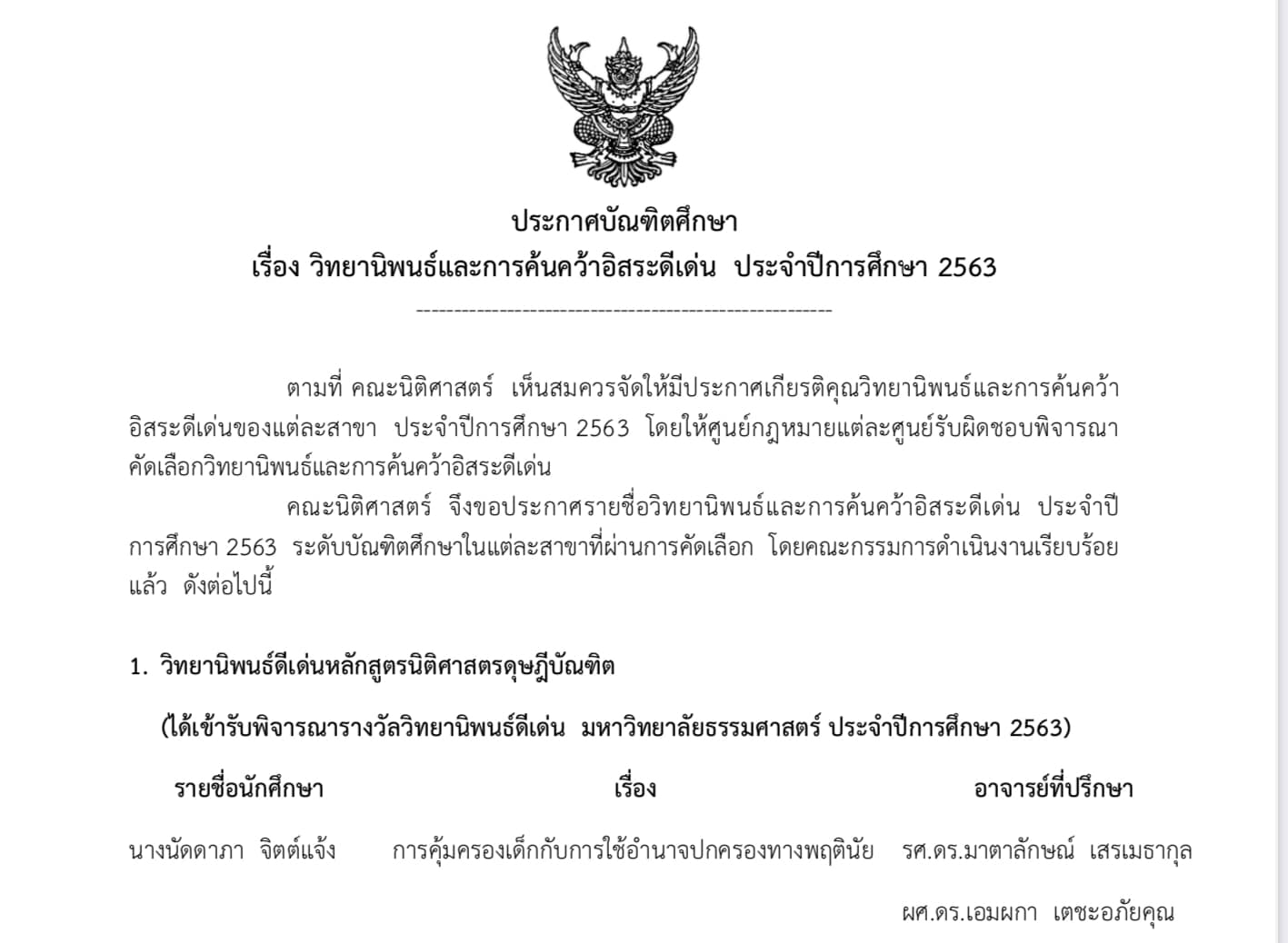 ได้รางวัลวิทยานิพนธ์ดีเด่นหลักสูตรนิติศาตรดุษฎีบัณฑิตของคณะนิติศาสตร์