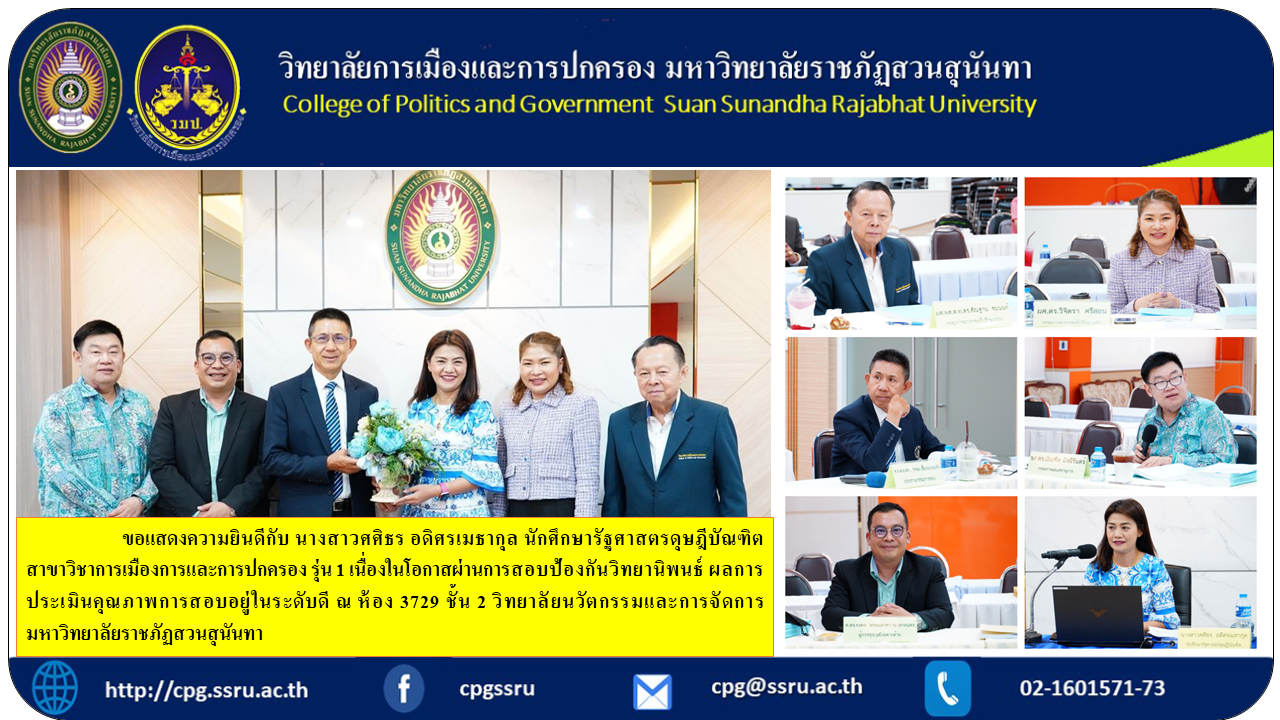 ขอแสดงความยินดีกับ นางสาวศศิธร อดิศรเมธากุล นักศึกษารัฐศาสตรดุษฎีบัณฑิต สาขาวิชาการเมืองการและการปกครอง รุ่น 1 เนื่องในโอกาสผ่านการสอบป้องกันวิทยานิพนธ์ ผลการประเมินคุณภาพการสอบอยู่ในระดับดี ณ ห้อง 3729 ชั้น 2 วิทยาลัยนวัตกรรมและการจัดการ มหาวิทยาลัยราชภัฏสวนสุนันทา