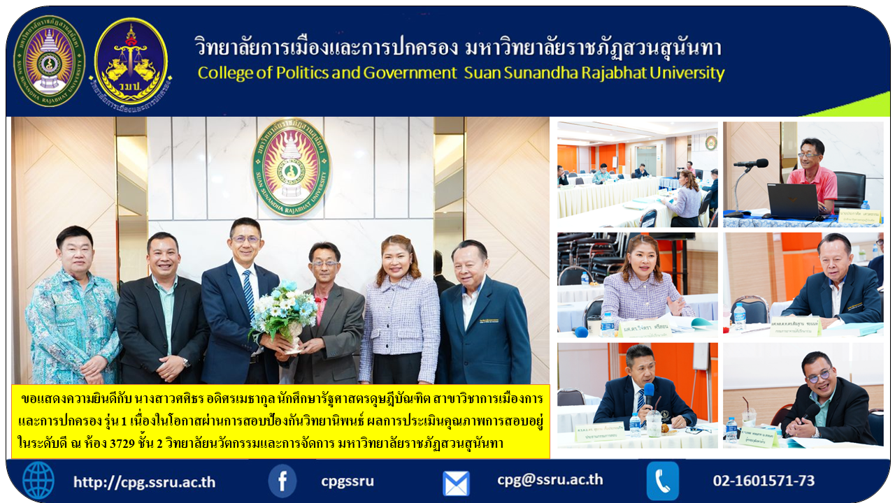 ขอแสดงความยินดีกับ นายประกาศิต เศวตธรรม นักศึกษารัฐศาสตรดุษฎีบัณฑิต สาขาวิชาการเมืองการและการปกครอง รุ่น 1 เนื่องในโอกาสผ่านการสอบป้องกันวิทยานิพนธ์ ผลการประเมินคุณภาพการสอบอยู่ในระดับผ่าน ณ ห้อง 3729 ชั้น 2 วิทยาลัยนวัตกรรมและการจัดการ มหาวิทยาลัยราชภัฏสวนสุนันทา