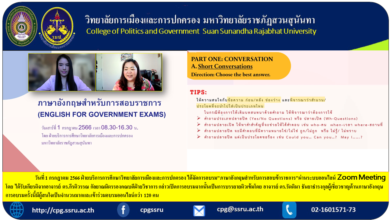 วันที่ 1 กรกฎาคม 2566 ฝ่ายบริการการศึกษาวิทยาลัยการเมืองและการปกครอง ได้จัดการอบรม"ภาษาอังกฤษสำหรับการสอบข้าราชการ"