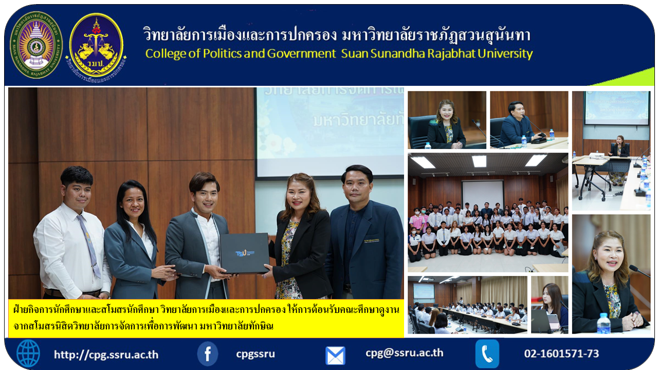 วันอังคาร ที่ 4 เมษายน เวลา 13.00 น. ณ. ห้องประชุมวนลักษณานงค์ กองพัฒนานักศึกษา ชั้น 3 ฝ่ายกิจการนักศึกษาและสโมสรนักศึกษา วิทยาลัยการเมืองและการปกครอง ให้การต้อนรับคณะศึกษาดูงานจากสโมสรนิสิตวิทยาลัยการจัดการเพื่อการพัฒนา มหาวิทยาลัยทักษิณ โดยมีผู้ช่วยศาสตราจารย์ ดร. วิจิตรา ศรีสอน รองคณบดีฝ่ายบริหารเป็นประธานและกล่าวต้อนรับ ผู้ช่วยศาสตราจารย์ ดร. บารมีบุญ แสงจันทร์ รองคณบดีฝ่ายกิจการนักศึกษา นำเสนอโครงสร้างและแนวปฏิบัติการขับเคลื่อนกิจกรรมด้านการพัฒนานักศึกษา นางสาว นวรัตน์ ดนตรี นายกสโมสรนักศึกษา นำเสนอเสนอผลงานและกระบวนการทำงานของคณะกรรมการสโมสรนักศึกษา รวมถึงการแลกเปลี่ยนเรียนรู้แนวทางการดำเนินงานของทั้ง 2 วิทยาลัย ตลอกจนการสร้างเครือข่ายแนวทางความร่วมมือการพัฒนานักศึกษาระหว่างวิทยาลัย สำหรับการศึกษาดูงานได้รับการประสานและผู้นำคณะ โดยอาจารย์ เสรี บุญรัตน์ อาจารย์ที่ปรึกษาด้านกิจการนักศึกษา สโมสรนิสิตวิทยาลัยการจัดการเพื่อการพัฒนา