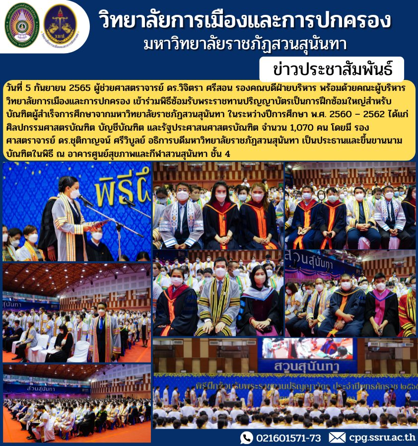 วันที่ 5 กันยายน 2565 ผู้ช่วยศาสตราจารย์ ดร.วิจิตรา ศรีสอน รองคณบดีฝ่ายบริหาร พร้อมด้วยคณะผู้บริหาร วิทยาลัยการเมืองและการปกครอง เข้าร่วมพิธีซ้อมรับพระราชทานปริญญาบัตรเป็นการฝึกซ้อมใหญ่สำหรับบัณฑิตผู้สำเร็จการศึกษาจากมหาวิทยาลัยราชภัฏสวนสุนันทา ในระหว่างปีการศึกษา พ.ศ. 2560 – 2562 ได้แก่ ศิลปกรรมศาสตรบัณฑิต บัญชีบัณฑิต และรัฐประศาสนศาสตรบัณฑิต จำนวน 1,070 คน โดยมี รองศาสตราจารย์ ดร.ชุติกาญจน์ ศรีวิบูลย์ อธิการบดีมหาวิทยาลัยราชภัฏสวนสุนันทา เป็นประธานและขึ้นขานนามบัณฑิตในพิธี ณ อาคารศูนย์สุขภาพเเละกีฬาสวนสุนันทา ชั้น 4