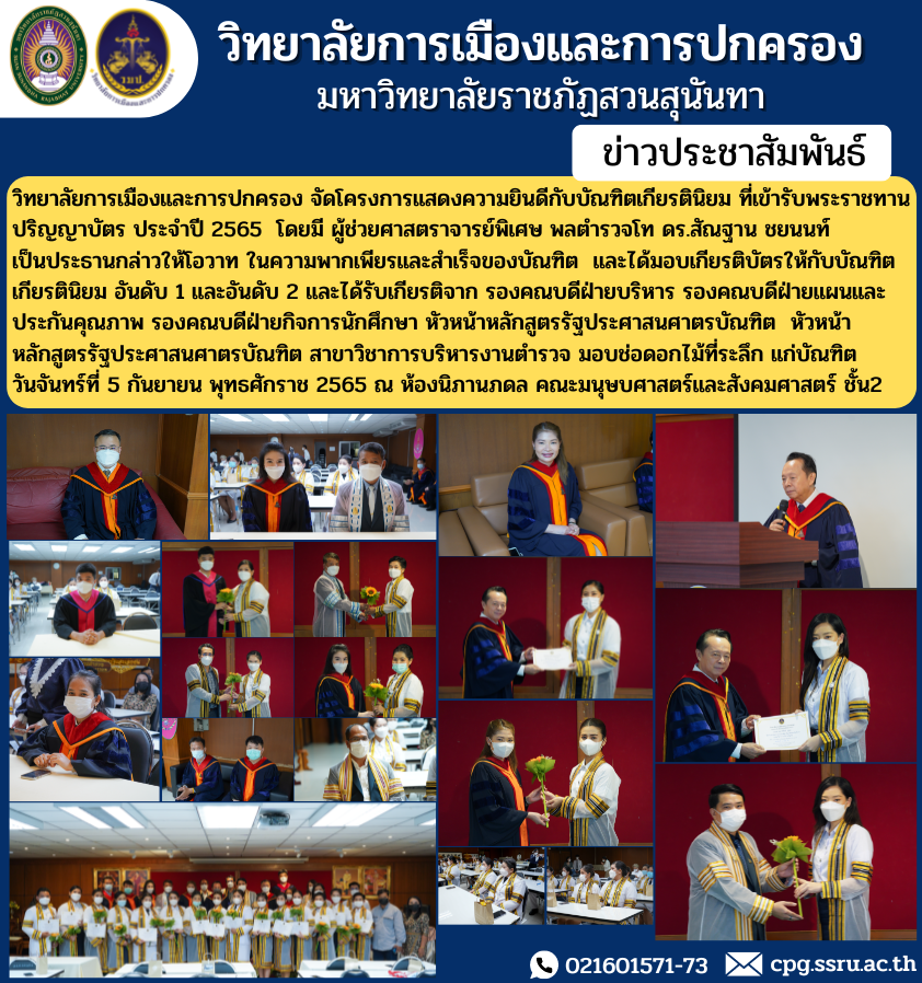 วิทยาลัยการเมืองและการปกครอง จัดโครงการแสดงความยินดีกับบัณฑิตเกียรตินิยม ที่เข้ารับพระราชทานปริญญาบัตร ประจำปี 2565 โดยมี ผู้ช่วยศาสตราจารย์พิเศษ พลตำรวจโท ดร.สัณฐาน ชยนนท์ เป็นประธานกล่าวให้โอวาท ในความพากเพียรและสำเร็จของบัณฑิต และได้มอบเกียรติบัตรให้กับบัณฑิตเกียรตินิยม อันดับ 1 และอันดับ 2 และได้รับเกียรติจาก รองคณบดีฝ่ายบริหาร รองคณบดีฝ่ายแผนและประกันคุณภาพ รองคณบดีฝ่ายกิจการนักศึกษา หัวหน้าหลักสูตรรัฐประศาสนศาตรบัณฑิต หัวหน้าหลักสูตรรัฐประศาสนศาตรบัณฑิต สาขาวิชาการบริหารงานตำรวจ มอบช่อดอกไม้ที่ระลึก แก่บัณฑิต วันจันทร์ที่ 5 กันยายน พุทธศักราช 2565 ณ ห้องนิภานภดล คณะมนุษบศาสตร์และสังคมศาสตร์ ชั้น2