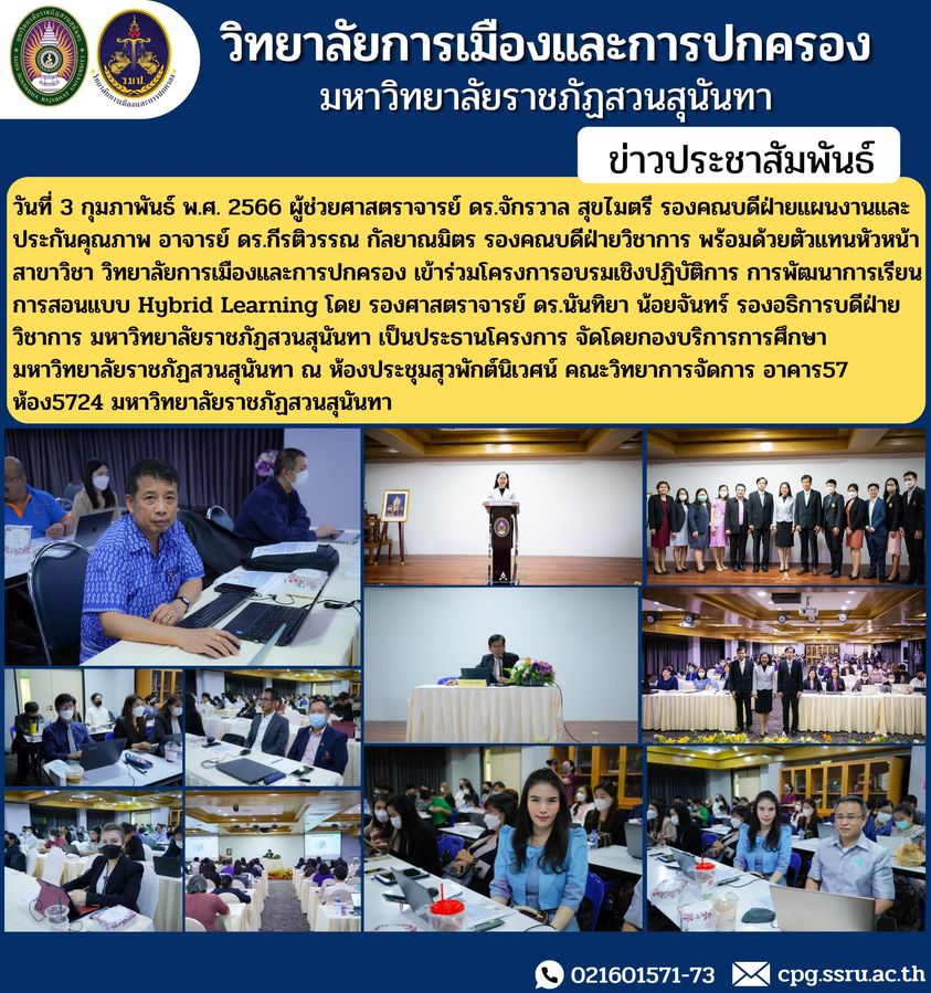 วันที่ 3 กุมภาพันธ์ พ.ศ. 2566 ผู้ช่วยศาสตราจารย์ ดร.จักรวาล สุขไมตรี รองคณบดีฝ่ายแผนงานและประกันคุณภาพ อาจารย์ ดร.กีรติวรรณ กัลยาณมิตร รองคณบดีฝ่ายวิชาการ พร้อมด้วยตัวแทนหัวหน้าสาขาวิชา วิทยาลัยการเมืองและการปกครอง เข้าร่วมโครงการอบรมเชิงปฏิบัติการ การพัฒนาการเรียนการสอนแบบ Hybrid Learning โดย รองศาสตราจารย์ ดร.นันทิยา น้อยจันทร์ รองอธิการบดีฝ่ายวิชาการ มหาวิทยาลัยราชภัฏสวนสุนันทา เป็นประธานโครงการ จัดโดยกองบริการการศึกษามหาวิทยาลัยราชภัฏสวนสุนันทา ณ ห้องประชุมสุวพักต์นิเวศน์ คณะวิทยาการจัดการ อาคาร57 ห้อง5724 มหาวิทยาลัยราชภัฏสวนสุนันทา