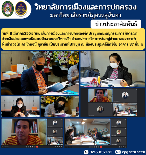 วันที่ 8 มีนาคม2564 วิทยาลัยการเมืองและการปกครองจัดประชุมคณะอนุกรรมการพิจารณาจ่ายเงินค่าตอบแทนพิเศษพนักงานมหาวิทยาลัย ตำแหน่งทางวิชาการโดยผู้ช่วยศาสตราจารย์ พันตำรวจโท ดร.ไวพจน์ กุลาขัย เป็นประธานที่ประชุม ณ ห้องประชุมคลีนิกวิจัย อาคาร 37 ชั้น 4