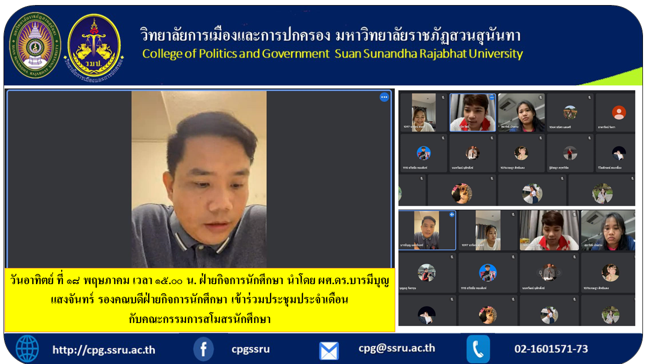 วันอาทิตย์ ที่ ๑๘ พฤษภาคม เวลา ๑๕.๐๐ น. ฝ่ายกิจการนักศึกษา นำโดย ผศ.ดร.บารมีบุญ แสงจันทร์ รองคณบดีฝ่ายกิจการนักศึกษา เข้าร่วมประชุมประจำเดือนกับคณะกรรมการสโมสรนักศึกษา โดยมีวาระการประชุมแจ้งเพื่อทราบและพิจารณา ทั้งในส่วนของแนวทางการดำเนินงานและการส่งมอบนโยบายของคณะกรรมการฯ วิทยาลัยการเมืองและการปกครอง ประจำปีการศึกษา ๒๕๖๔-๒๕๖๕